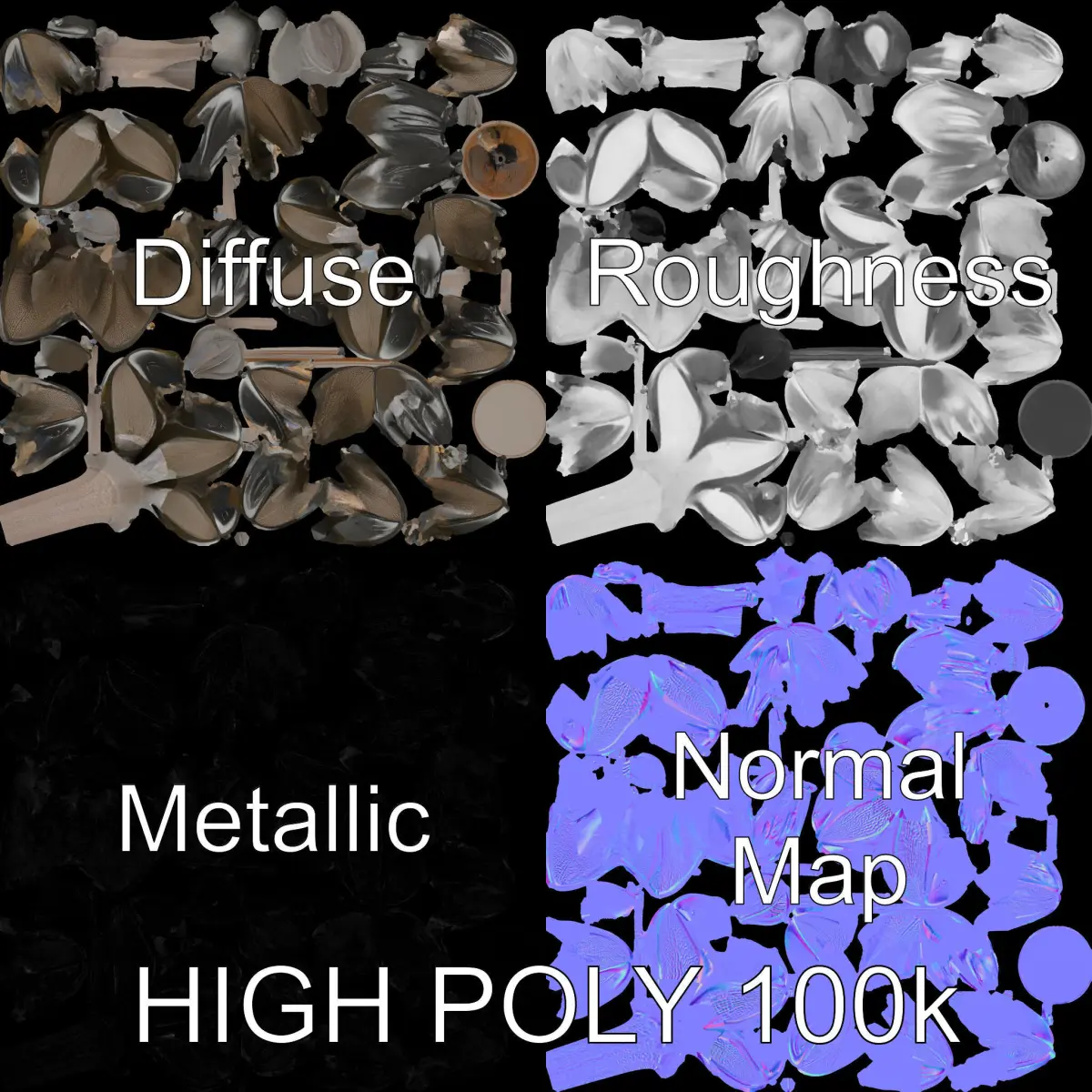 This Stylized Metal Flower Sculpture Model Pack offers three levels of detail for diverse applications: low-poly for mobile, mid-poly for environmental scenes, and high-poly for high-quality productions. Ideal for art scenes, interior decor renders, and educational displays, its PBR, Diffuse, NormalMap, and reflection/roughness/metallic textures ensure versatile compatibility across modern rendering engines. Each model is perfectly unwrapped with 4096*4096 textures, free of overlapping UVs. The first image is the reference used for creating the 3D model. It is important to carefully evaluate the quality of the model by examining the preview images that display the topology and polygonal mesh. These previews (WIRE and WEB 3D Preview) clearly demonstrate how accurately the model matches the original reference and how well the geometry has been executed. Like and comment if you find the model useful.