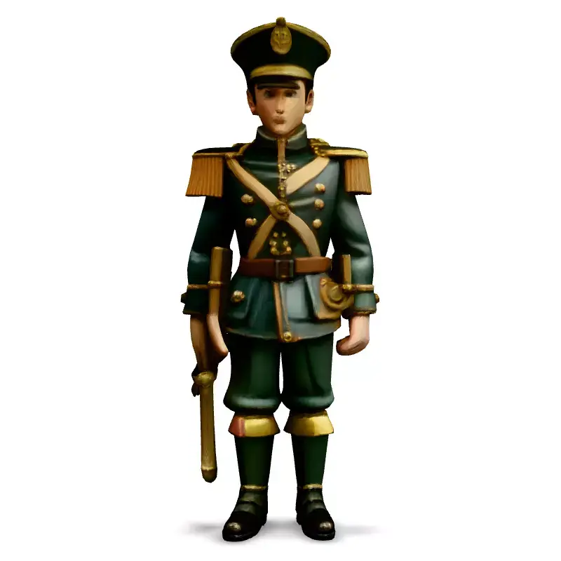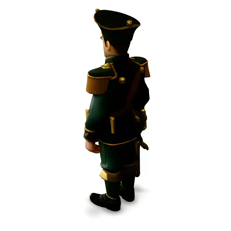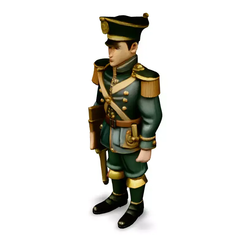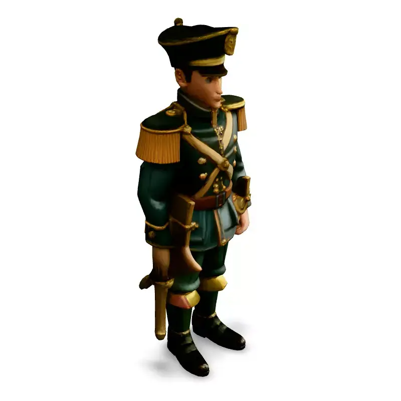 This 3D model depicts a stylized military officer in a green and gold uniform. Ideal for game development, AR/VR experiences, historical visualizations, and animated films. The model is available in multiple formats including GLB, OBJ, FBX, and STL. It's optimized for real-time use in games and AR, boasting a low-poly count while maintaining a visually appealing level of detail. The character features clean topology, is UV unwrapped, and includes PBR textures, ensuring realistic rendering in various lighting conditions. This asset can be easily integrated into different projects, from creating immersive historical experiences to developing engaging game characters. It's suitable for both close-up shots and dynamic scenes. The model is ready for rigging and animation, making it a versatile addition to any digital project. Whether you're crafting a historical narrative, developing a strategy game, or building an AR experience, this stylized military officer provides a unique and captivating visual element.