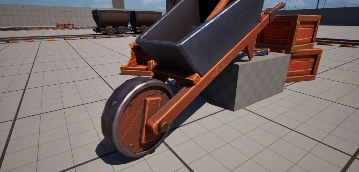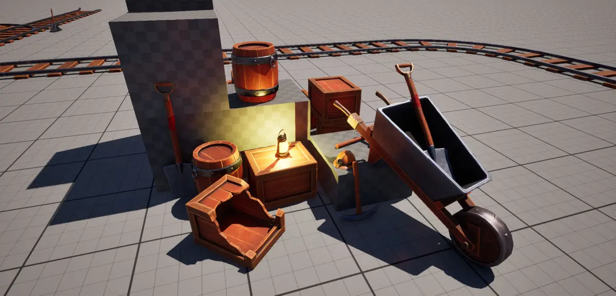 The pack includes environmental objects, a cart, a handcar, rails and tools.Perfect for decorating a mine or similar environment in games of any genre.