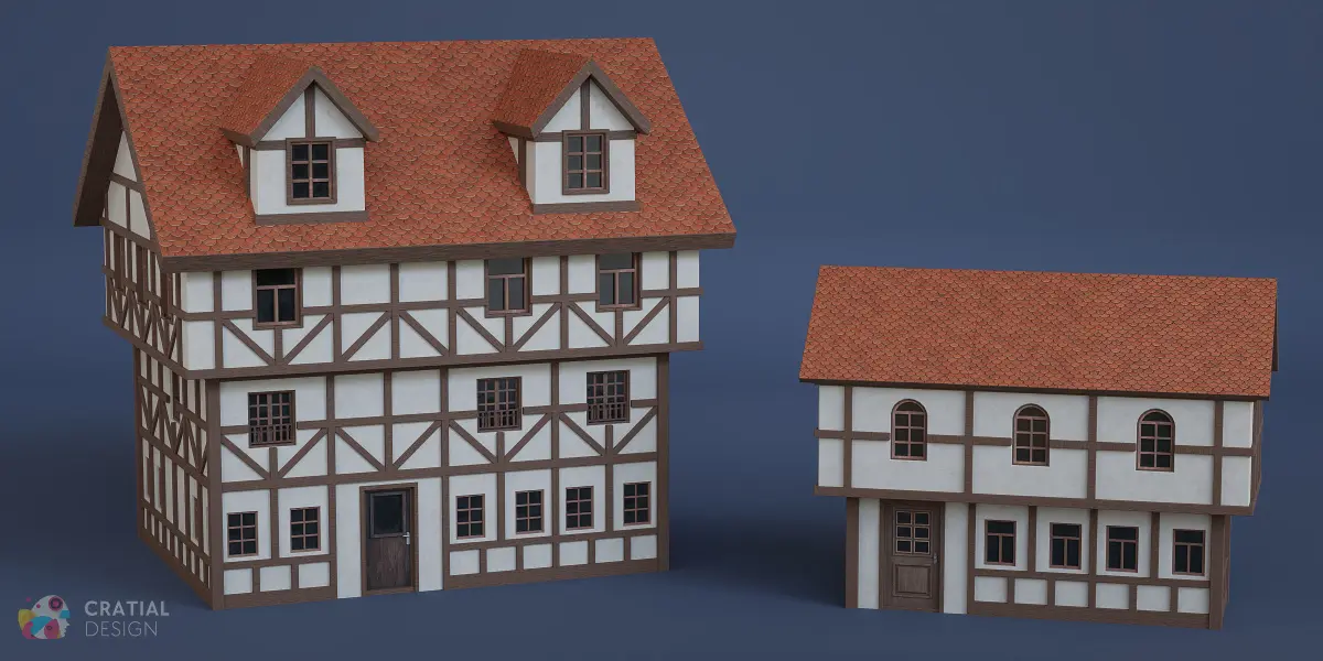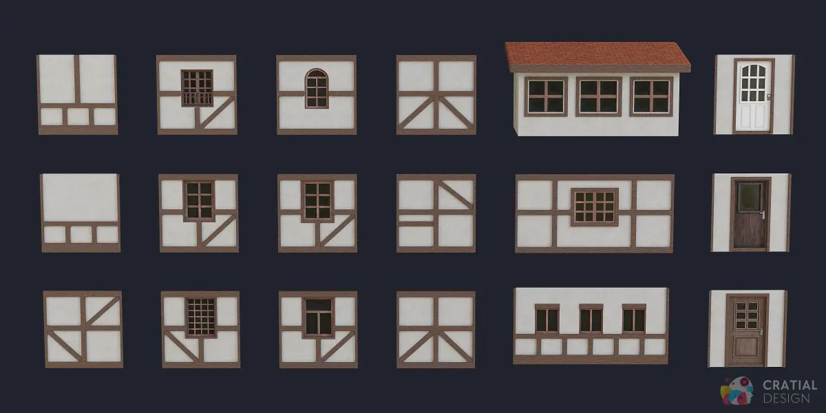 - The kit uses five texture sets in total: plaster, wood, roof tiles, glass, and accessories