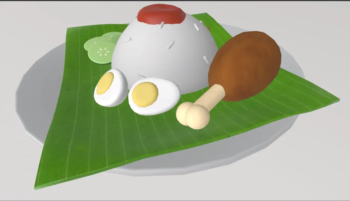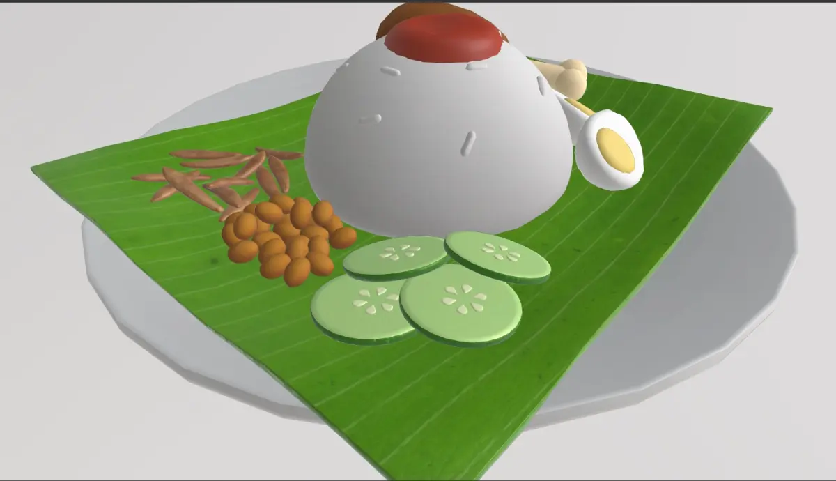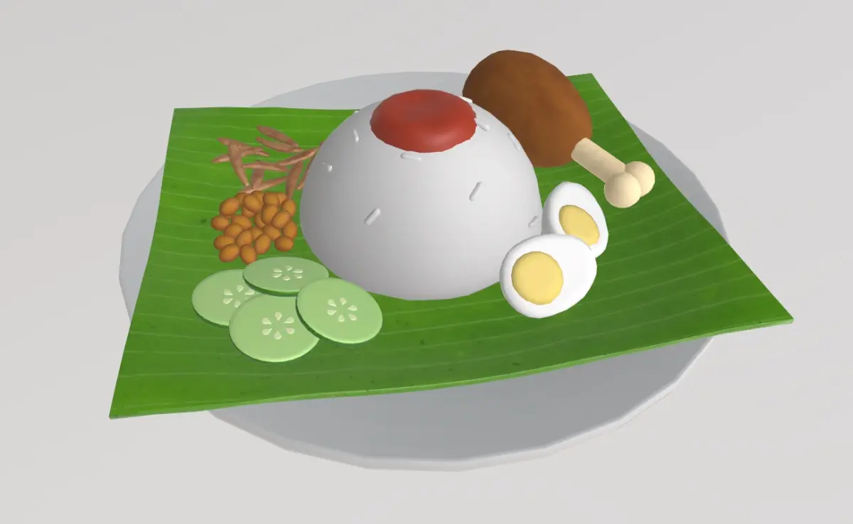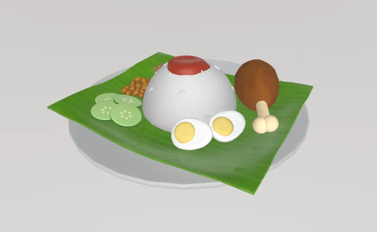 A vibrant and highly detailed stylized Nasi Lemak set, perfect for adding a touch of Malaysian cuisine to your game environments, 3D animations, or VR/AR projects. This set includes both the classic unwrapped Nasi Lemak served on a plate with a spoon, and the iconic wrapped Nasi Lemak in banana leaves, showcasing the charm of traditional Southeast Asian food presentation.