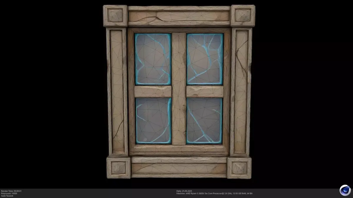 A stylized 3D model of an old, cracked window, perfect for adding a sense of age and decay to your fantasy, medieval, or rustic environments. The model features a stone frame with visible cracks and a worn wooden interior frame. The glass panes are shattered with a glowing blue edge, giving it a magical or ethereal quality. This asset is a great prop for castles, abandoned houses, or wizard towers.