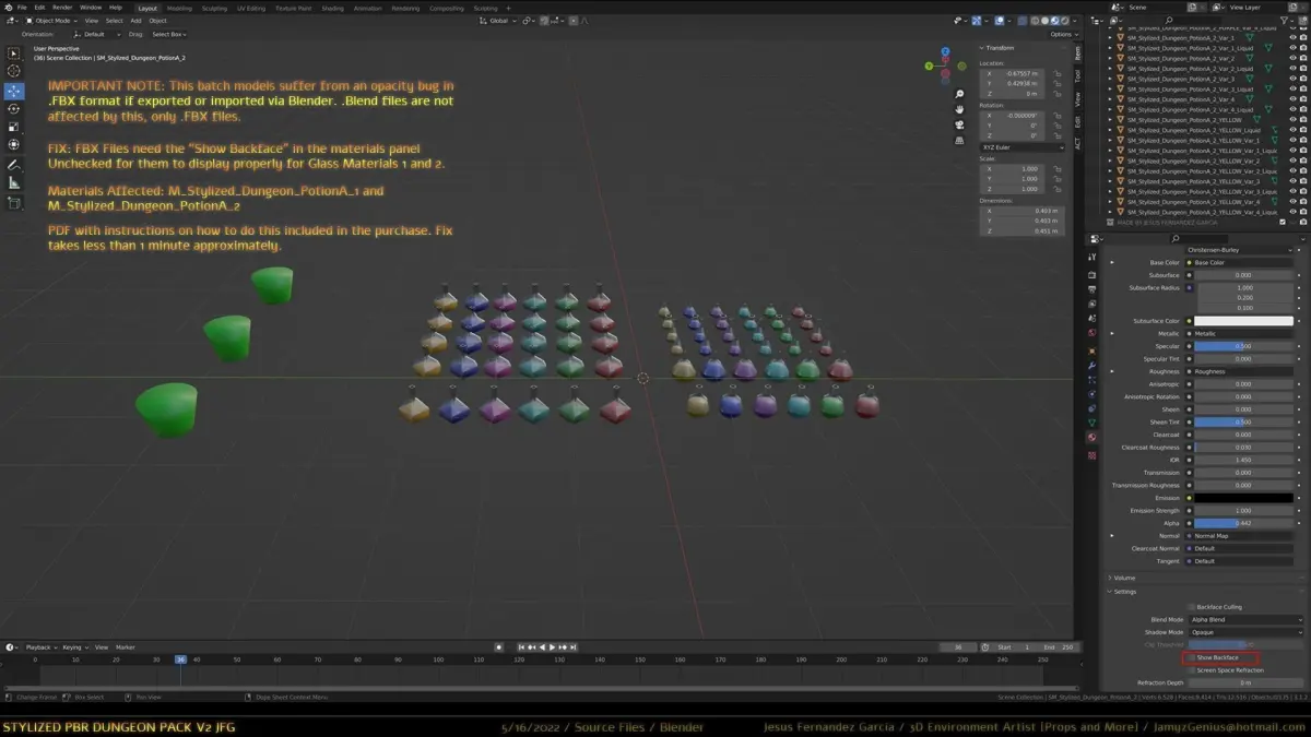 The second pdf is inside the “batch 11” folder and will be in the root folder where this pdf is too. That pdf file includes instructions to fix the opacity in-case the batch 11 fbx potions are used. They have a bug with the opacity when re-imported to Blender or exported from the same [FBX files only]. Blender files [.Blend] work fine. More info on that file. The fix requires un-ticking the “Show Backface” box in the materials panel for glass 1 and 2 for the potions in order to fix after importing into Blender again.