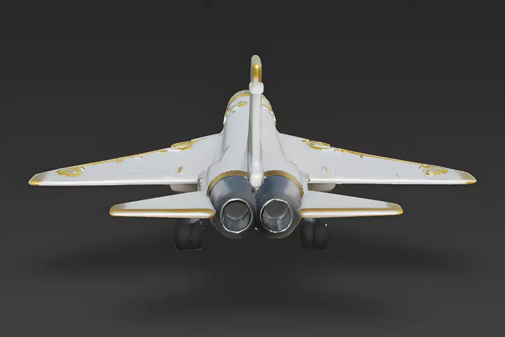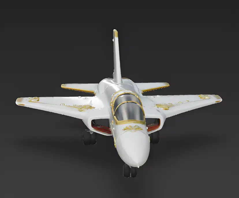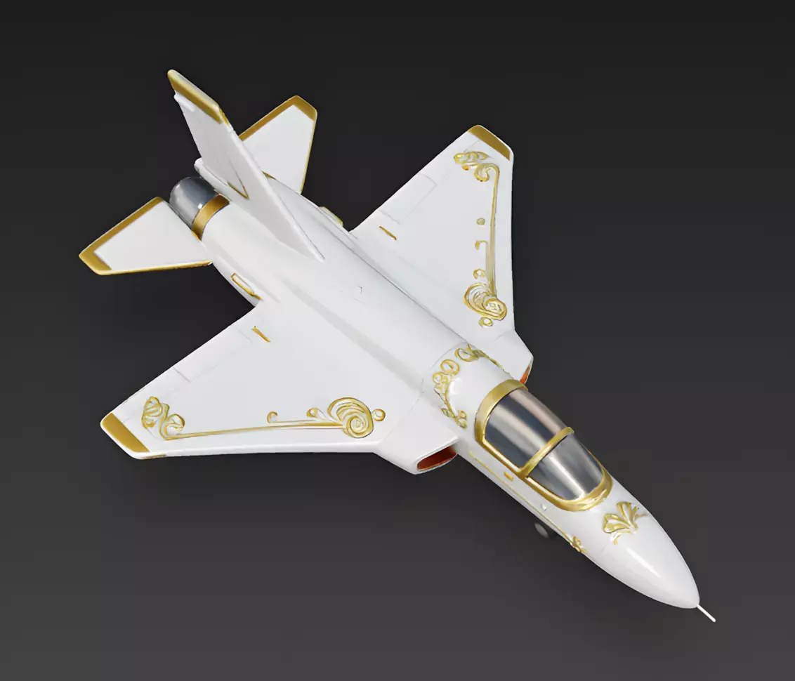 Gold Filigree Detail AccentsThe wings and fuselage are decorated with intricate gold filigree patterns. These elements are modeled as solid, chunky geometry rather than delicate textures, providing a high-contrast luxury feel that stands out beautifully against the white body.
