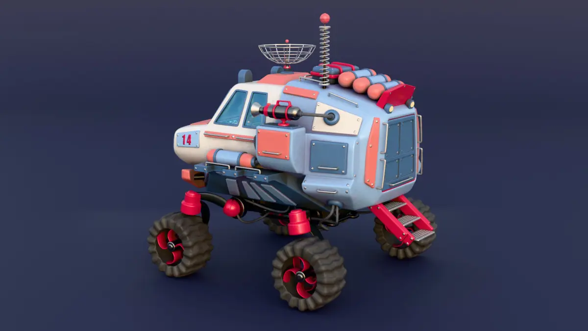 Stylized planetary rover. Made in Blender 3D 4.4 (Cycles/Eevee materials). UV Layout maps and Image Textures resolutions: 2048x2048, 4096x4096. This model employs UDIM textures to enhance detail. Textured in Substance 3d painter.These textures were designed to be used with a subdivision surface modifier (The textures will not display correctly without it).