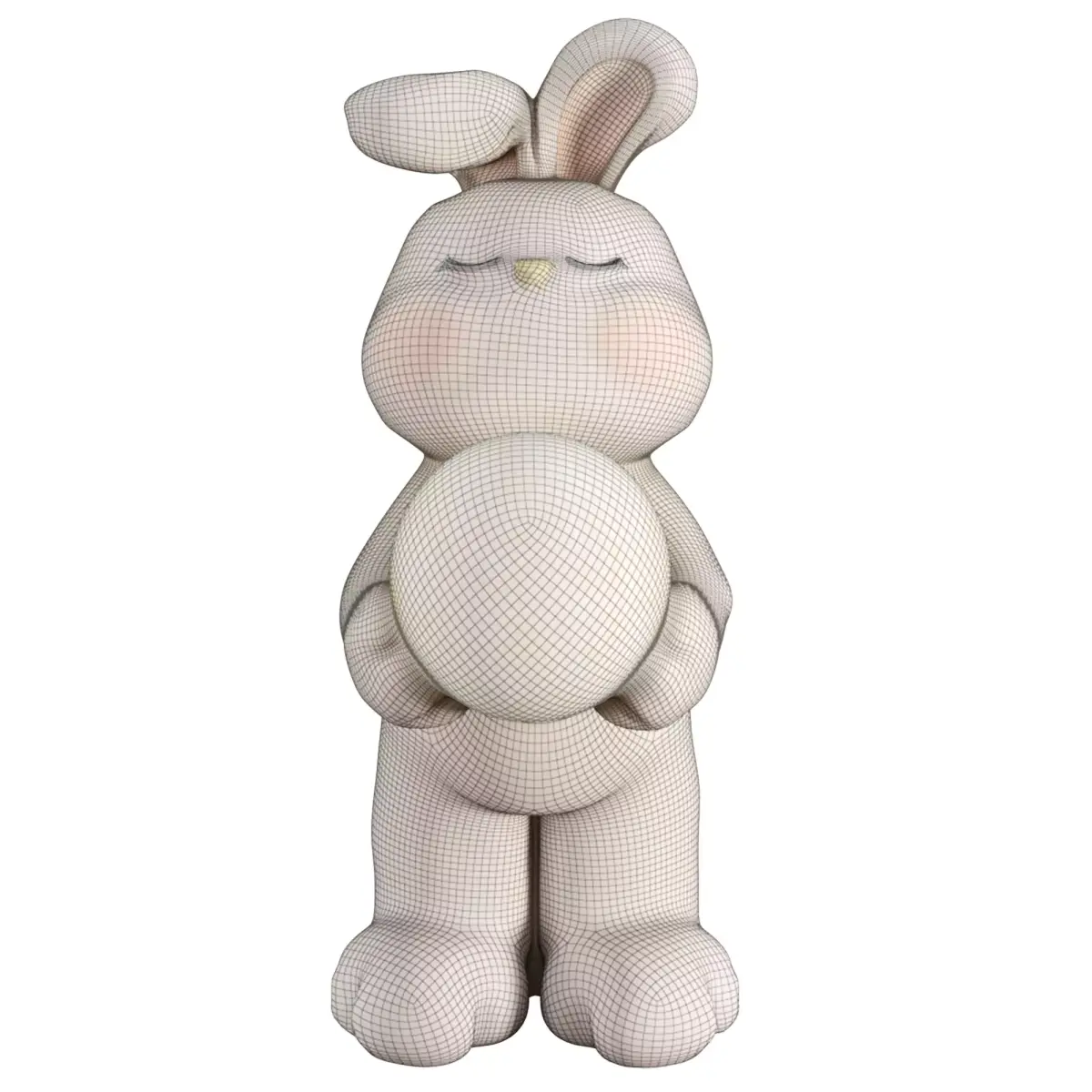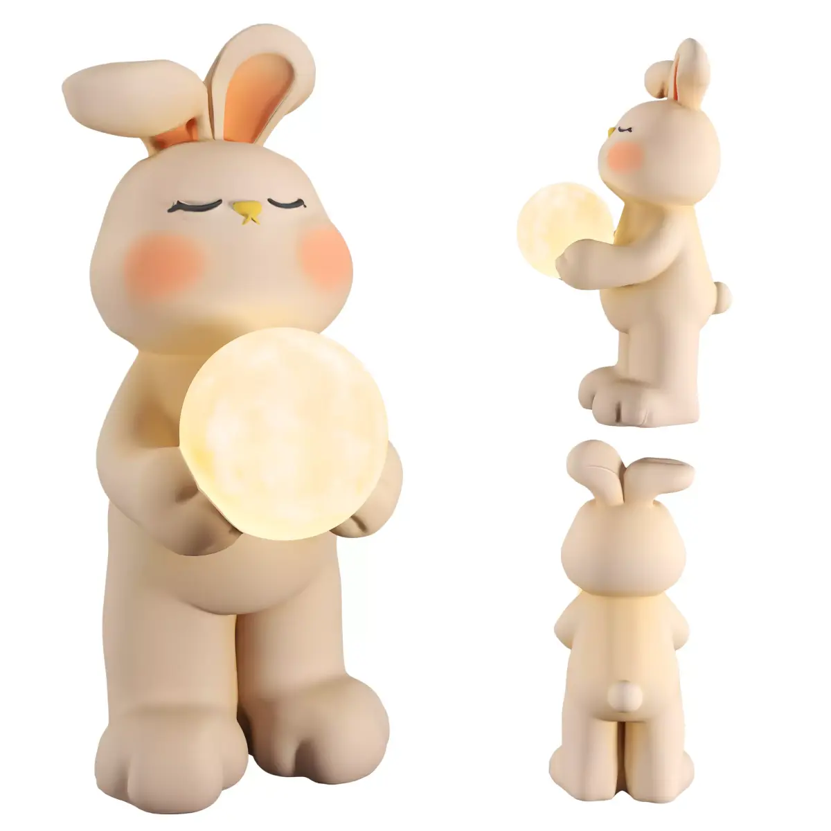 Design & Pose: The model depicts a cute, anthropomorphic bunny standing upright on its hind legs. It is holding a large, glowing sphere (representing a full moon) against its chest. The bunny has a peaceful expression with closed eyes and soft pink blushed cheeks, conveying a sense of calm and sleep.