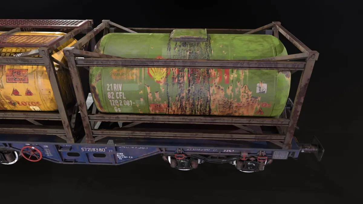 A stylized railway platform with tanks, with elements of dirt, old paint, scuffs, rust, inscriptions and stickers.