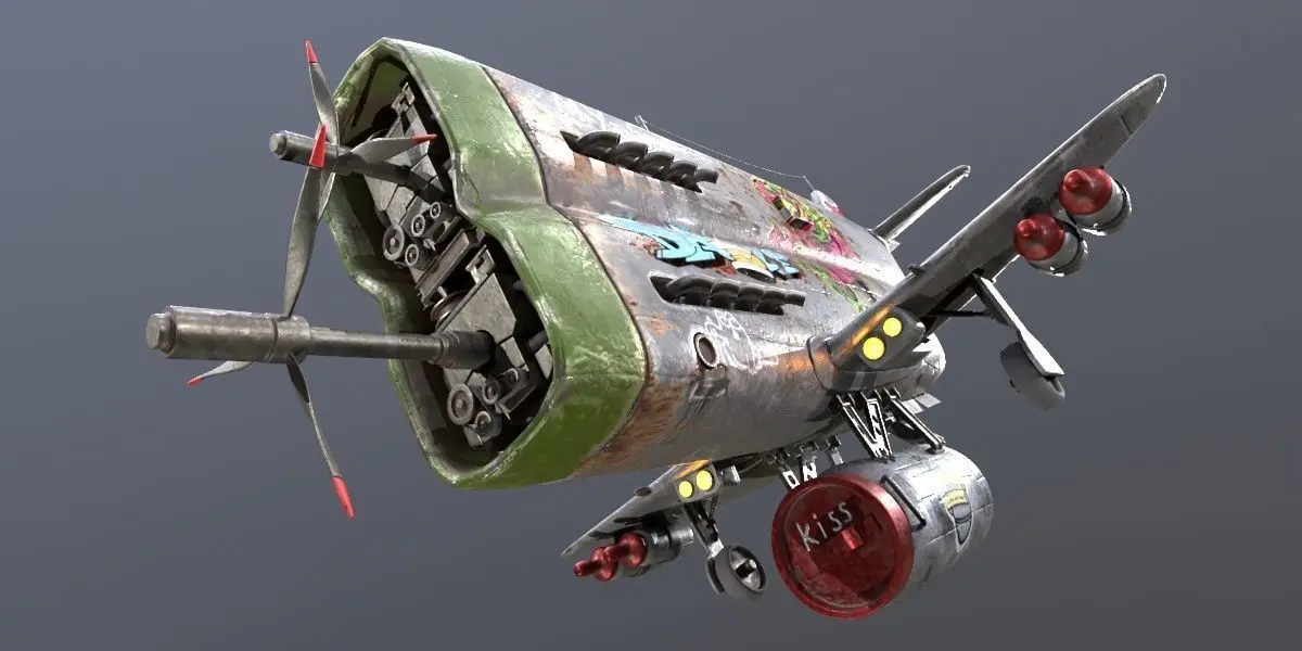 A stylized realistic airplane with various elements of wear and tear such as rust, scratches, old paint on top of other old paint, dirt, graffiti, lettering and sooted fuel streaks!