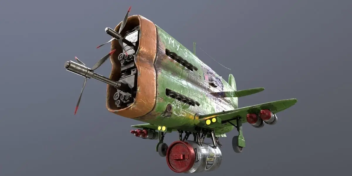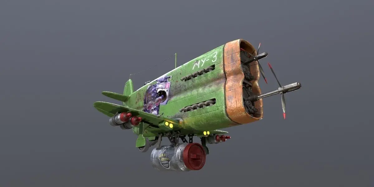 A stylized realistic airplane with various elements of wear and tear such as rust, scratches, old paint on top of other old paint, dirt, graffiti, lettering and sooted fuel streaks!