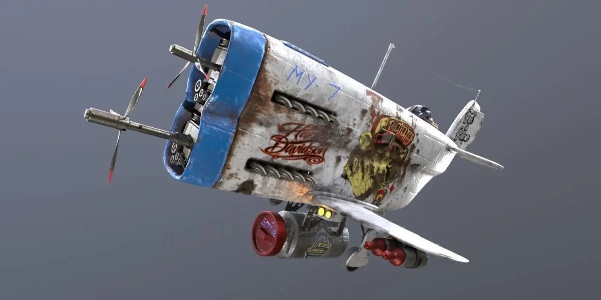 A stylized realistic airplane with various elements of wear and tear such as rust, scratches, old paint on top of other old paint, dirt, graffiti, lettering and sooted fuel streaks!