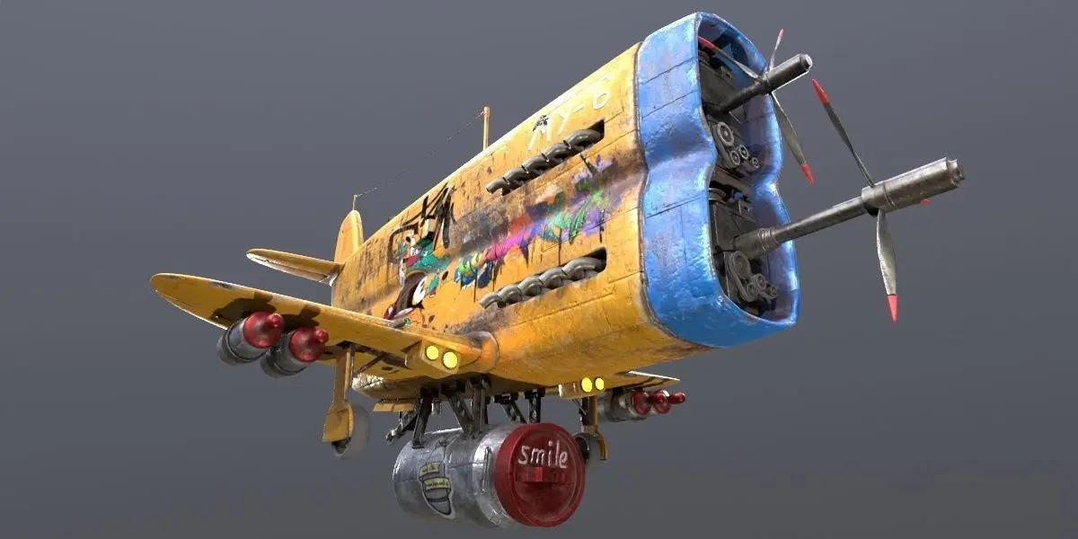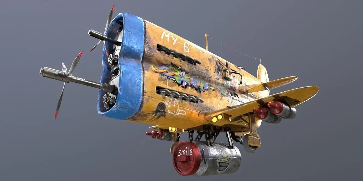 A stylized realistic airplane with various elements of wear and tear such as rust, scratches, old paint on top of other old paint, dirt, graffiti, lettering and sooted fuel streaks!