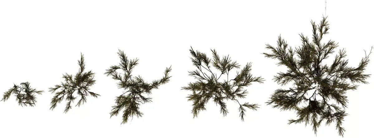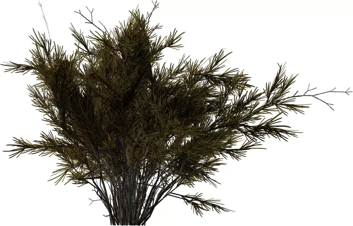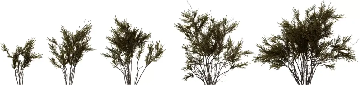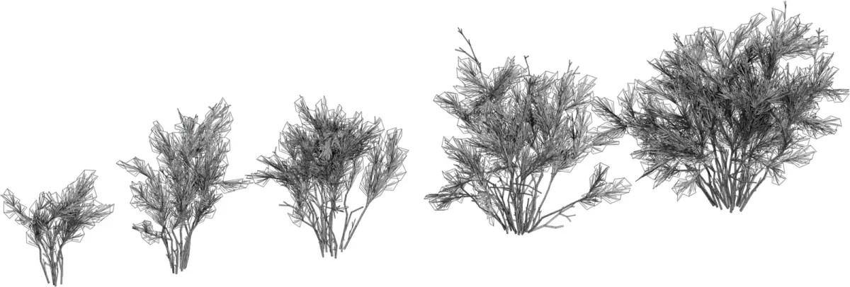 This pack offers five variations of stylized rosemary‑like shrubs with thin woody stems and dense needle clusters, ideal for Mediterranean gardens, herb planters, or rocky hillsides. Each model progresses from a small sprig to a full mature bush, allowing natural variation when scattering them in larger environments. Geometry is optimized with efficient branch structures and foliage cards, keeping the assets lightweight for real‑time engines while still reading clearly in close‑up renders. PBR textures include color, roughness, and normal maps that capture subtle tint shifts between green and brown needles plus bark detail on the stems. UVs are cleanly unwrapped and share consistent texel density, making material edits and LOD creation straightforward in major DCC tools and game engines. These shrubs work well as ground‑level decor, planter herbs, or low bushes in stylized and semi‑realistic outdoor scenes.