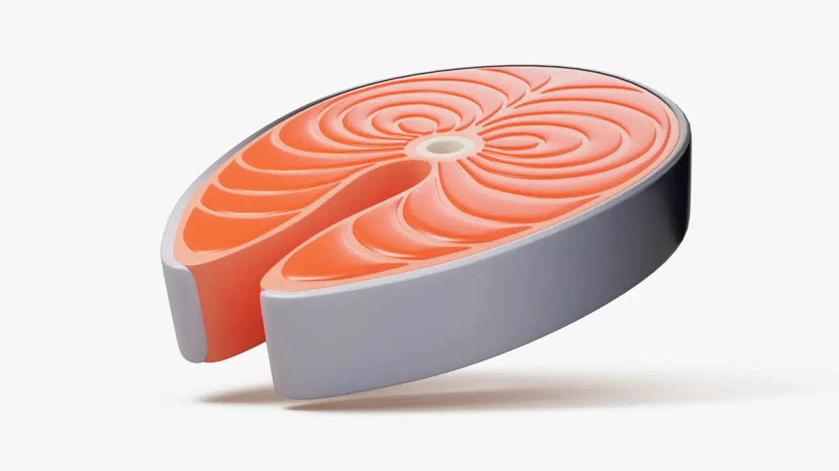A vibrant stylized 3D salmon steak with smooth details and clean cartoon aesthetics. This glossy fish cut model is perfect for food-related games, farm simulators, mobile icons, and cooking interfaces. The shape is clean and recognizable with a bright orange color to stand out in any stylized scene.