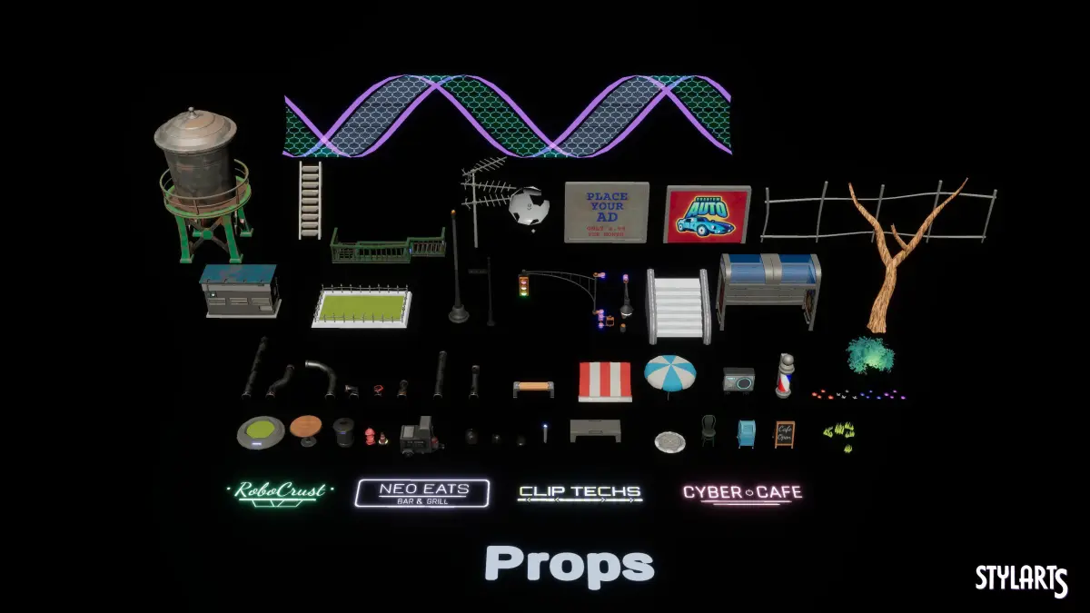 Features:136 Unique MeshesAttention to Detail / AAA QualityControllable parameters in MaterialsHigh-Quality AssetsGame ready/OptimizedUnique Concepts of AssetsHigh Attention to DetailsMaterial Variations For Some AssetsTexture Sizes:20481024Collision: Yes, Custom collisions for complex assetsLODs: YesAverage Poly Count: around 1K up to 11KTexture Map Types: Base Color / Diffuse, Normal, Smoothness / Roughness, Metalic, OpacityMaterials: This asset contains PBR based materials which means each material contains a Base Texture, and a Normal Texture by default and additionally has Smoothness, Ambient Occlusion, Metalic and Opacity Texture Maps according to the material.Props: Tree, Billboard, Bench, Pipes, Hologram, Decals etc.. [Resolution 2048x] [Diffuse, Normal, Roughness, Opacity, AO, Metalic]