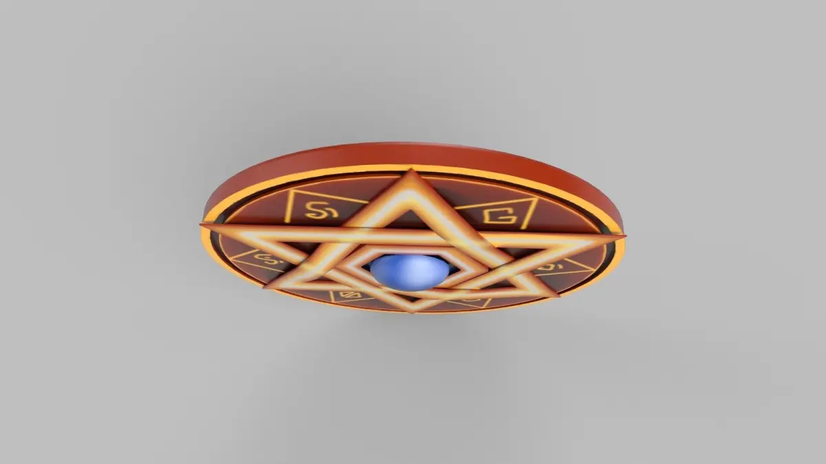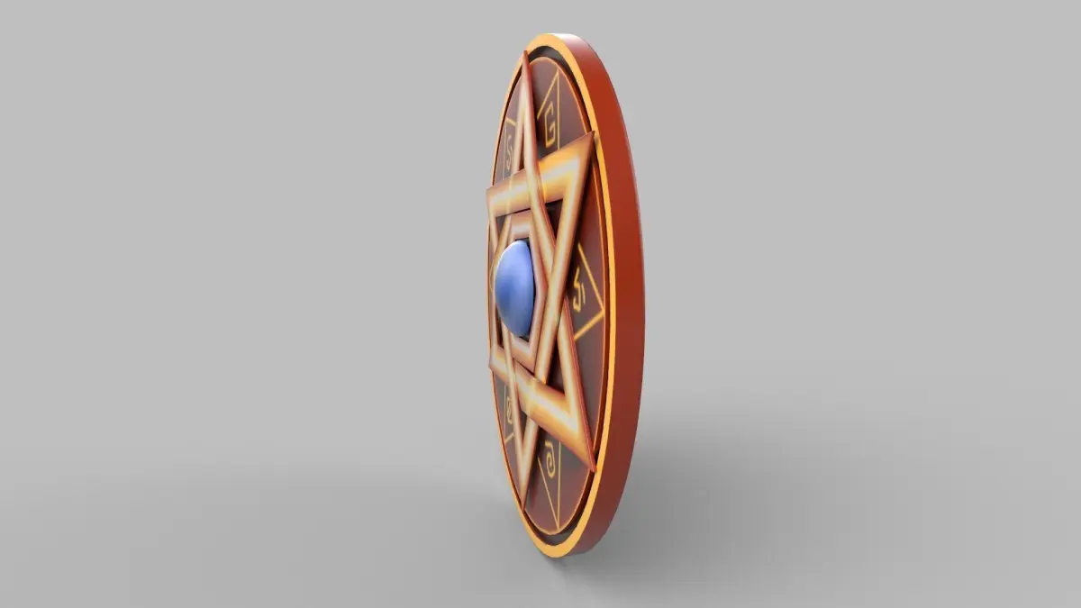A 3D model of a stylized shield.