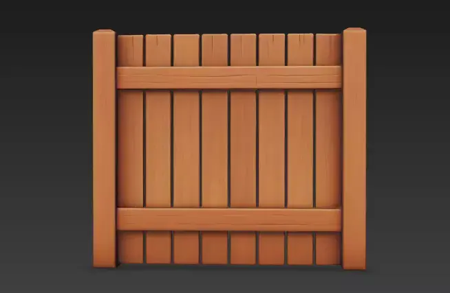 Simplified Picket ConstructionA primary feature of this model is the simplified construction consisting of eight wide, solid wooden pickets. Each picket is modeled as a chunky rectangular volume with smooth edges, ensuring the asset remains highly readable and visually appealing from various camera perspectives.