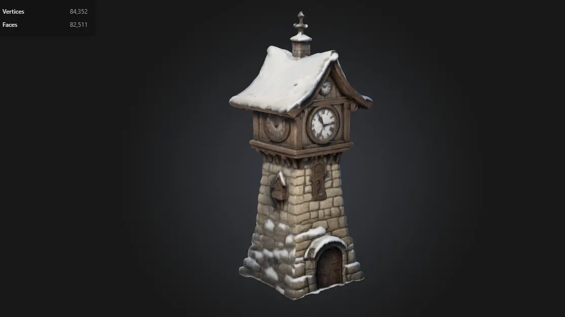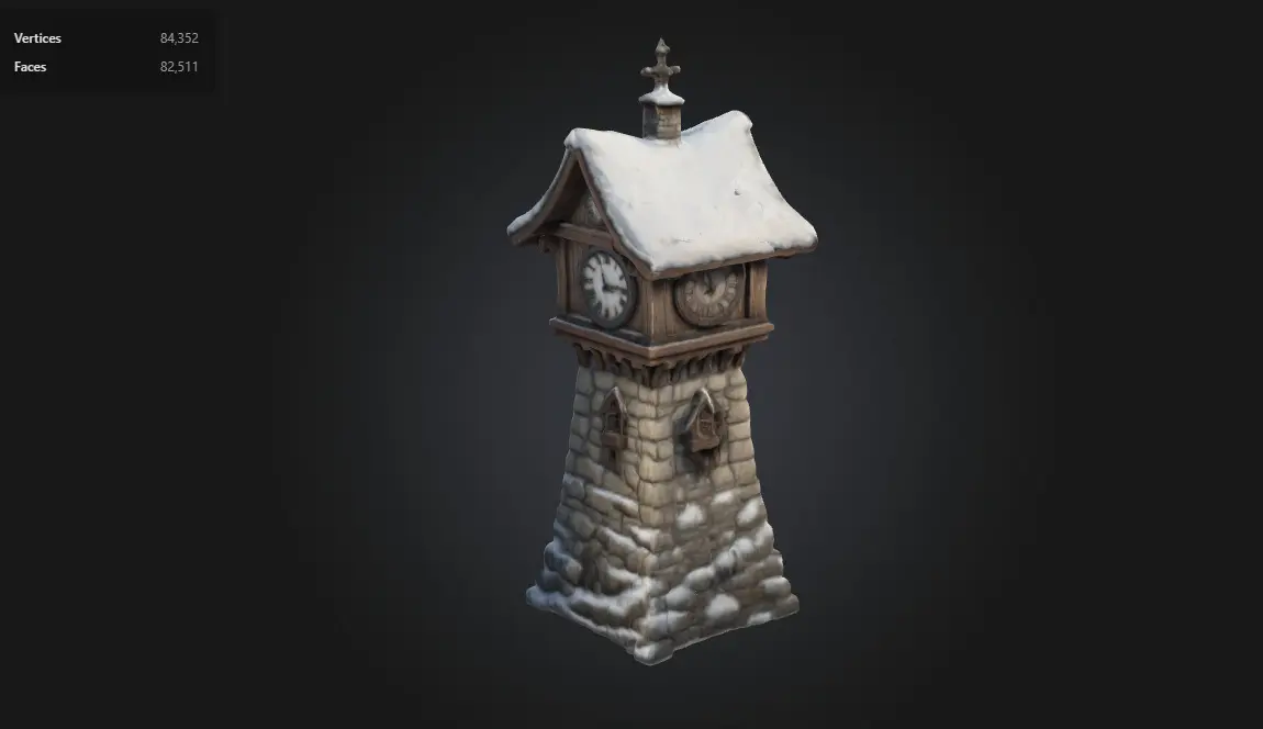 A charming stylized wooden clock tower covered in winter snow, with a stone base and classic timepiece faces on all sides. This model fits perfectly in festive town squares, magical village scenes, or any winter-themed fantasy environments.