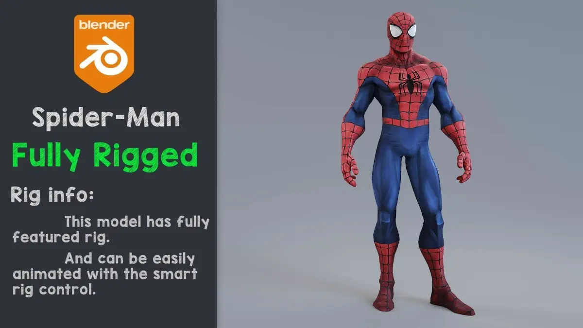 A Spiderman rigged 3d model from marvel studios in a classic style made in Blender with all parts are textured including normals. He also has a fully featured rig like facial rigs to make animations.