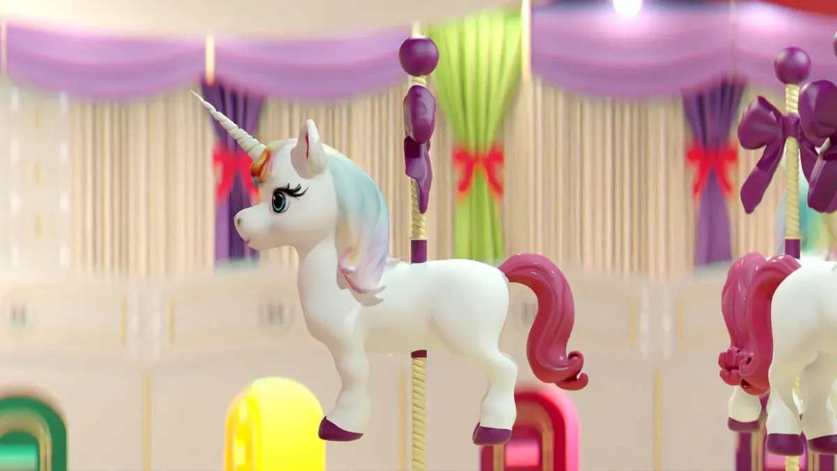 Interactive Centerpiece: A rotating platform featuring three vividly designed unicorns with bright rainbow accents and playful bows. Carousel-like structure with customizable rotation speeds for enhanced engagement in gameplay environments.