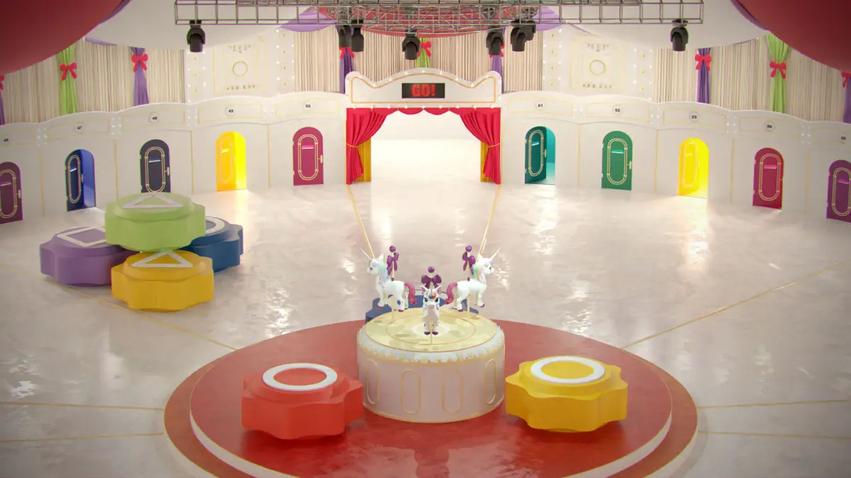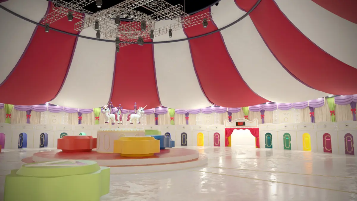 Tags: Squid Game, arena, carousel, survival game, 3D environment, cinematic model, game assets, VR ready, colorful doors, textured scene, gaming arena, pink guards, carousel horses, high-detail props, Circus Map, Squid Game, Doll Game Map, Interactive 3D Environment, Game Level, Carousel Unicorn, Carnival Game Design, VR Ready, AR Environment, Bright Circus Theme, Squid Game Doll Map