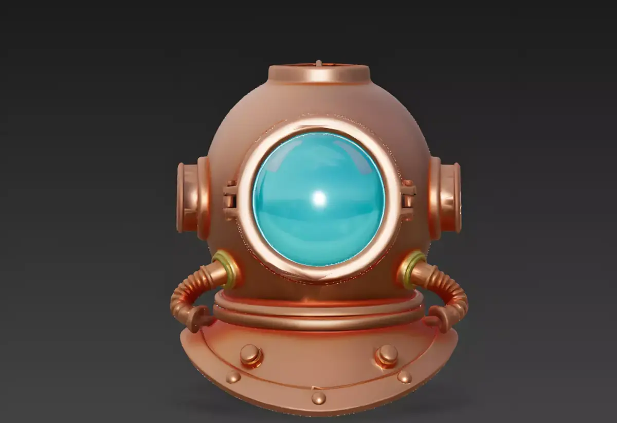 Reinforced Riveted BaseThe helmet sits on a wide, flared base adorned with oversized, rounded rivets. These chunky details provide a grounded and durable appearance, ensuring the asset is easily readable as a heavy-duty diving apparatus from various camera angles within a 3D scene.