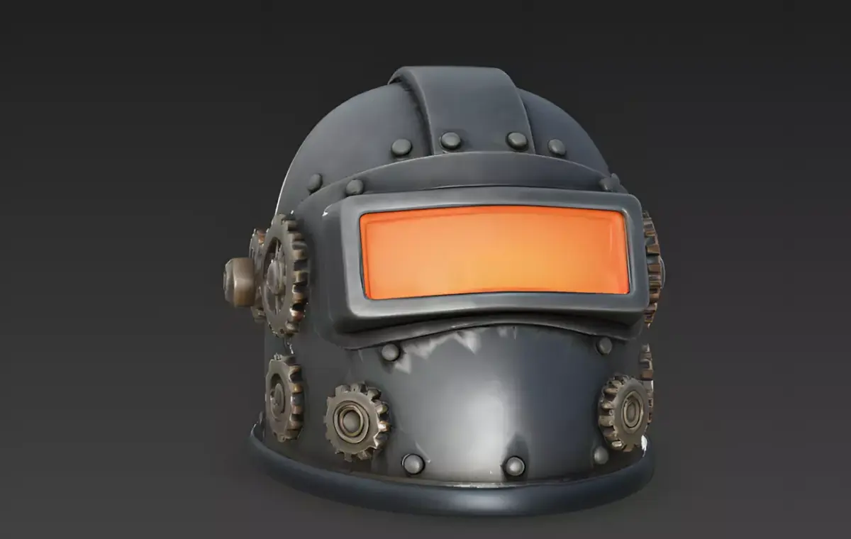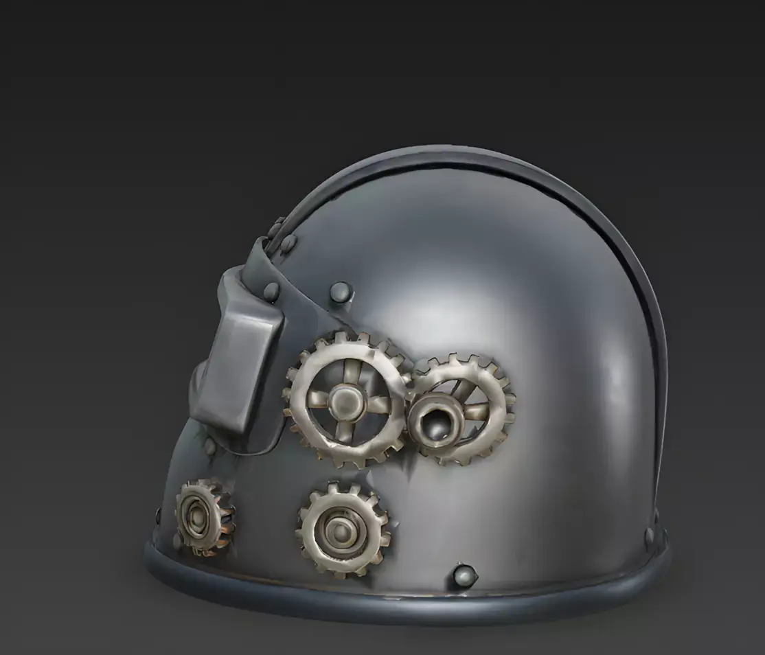 Symmetrical Gear and Rivet DetailsThe helmet is adorned with simplified mechanical components, including a vertical row of decorative gears and oversized, rounded rivets. These bold, unadorned shapes are modeled as solid geometric volumes with smooth edges, reinforcing the asset's sturdy and illustrative design language while providing clear visual interest.