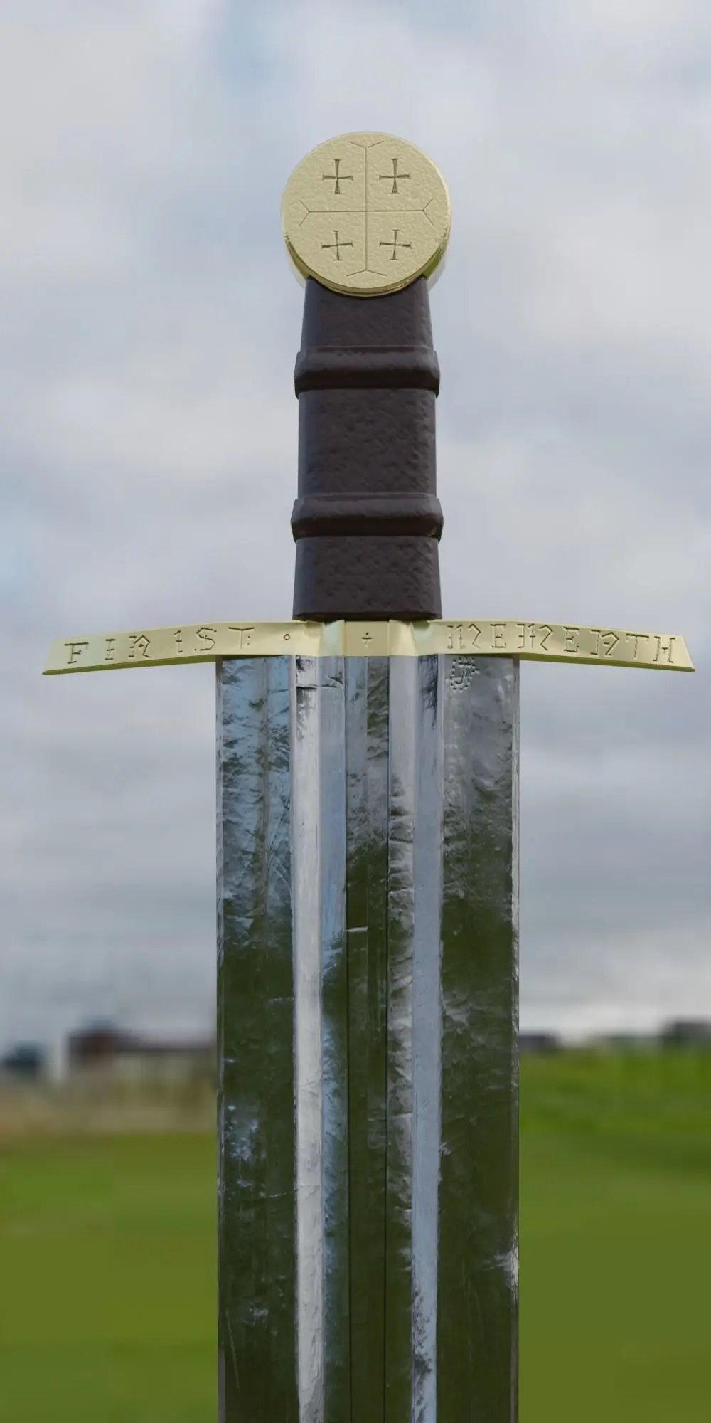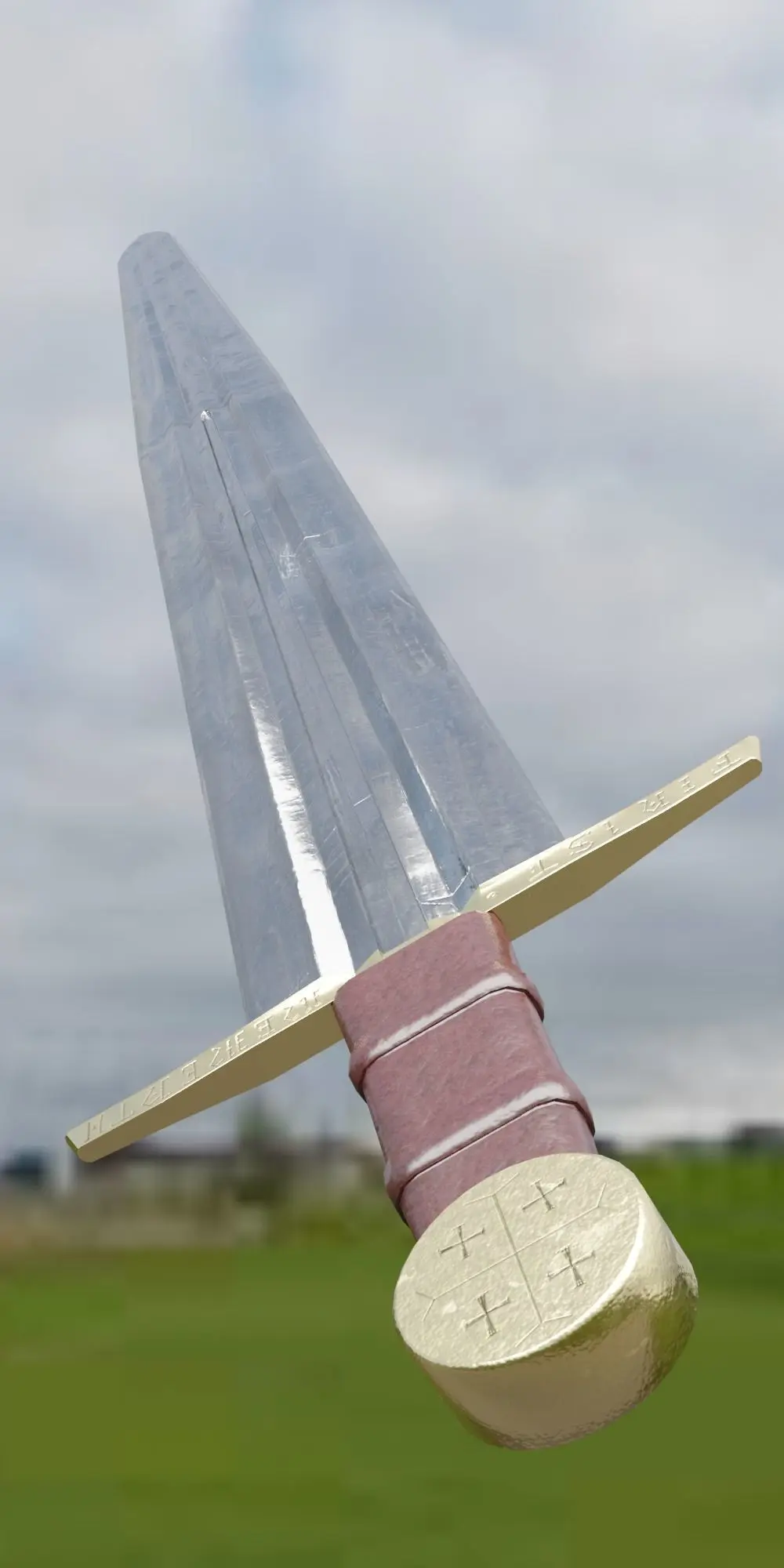 Steel sword, gilded garda(cross) with runic inscriptions, leather hilt