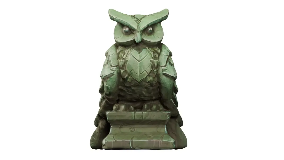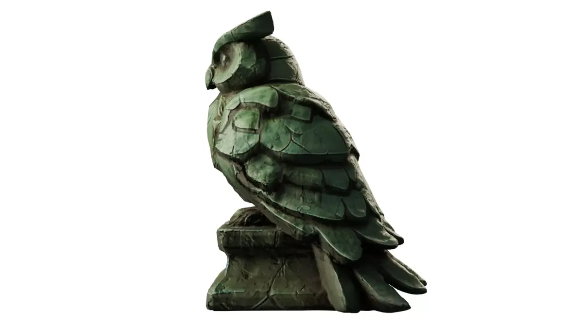 A highly detailed stylized stone owl statue featuring layered, armor-like feather carvings and a strong, elegant silhouette. The sculpted stone texture and intricate shapes give it a handcrafted, ancient aesthetic, making it an excellent fit for fantasy temples, ruins, magical environments, puzzle rooms, or collectible hero props.
