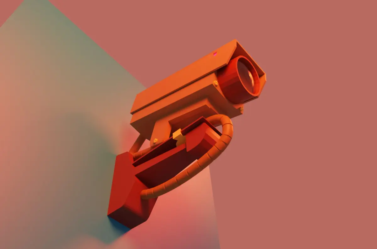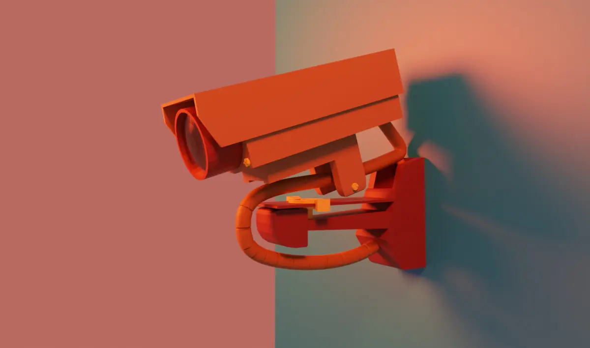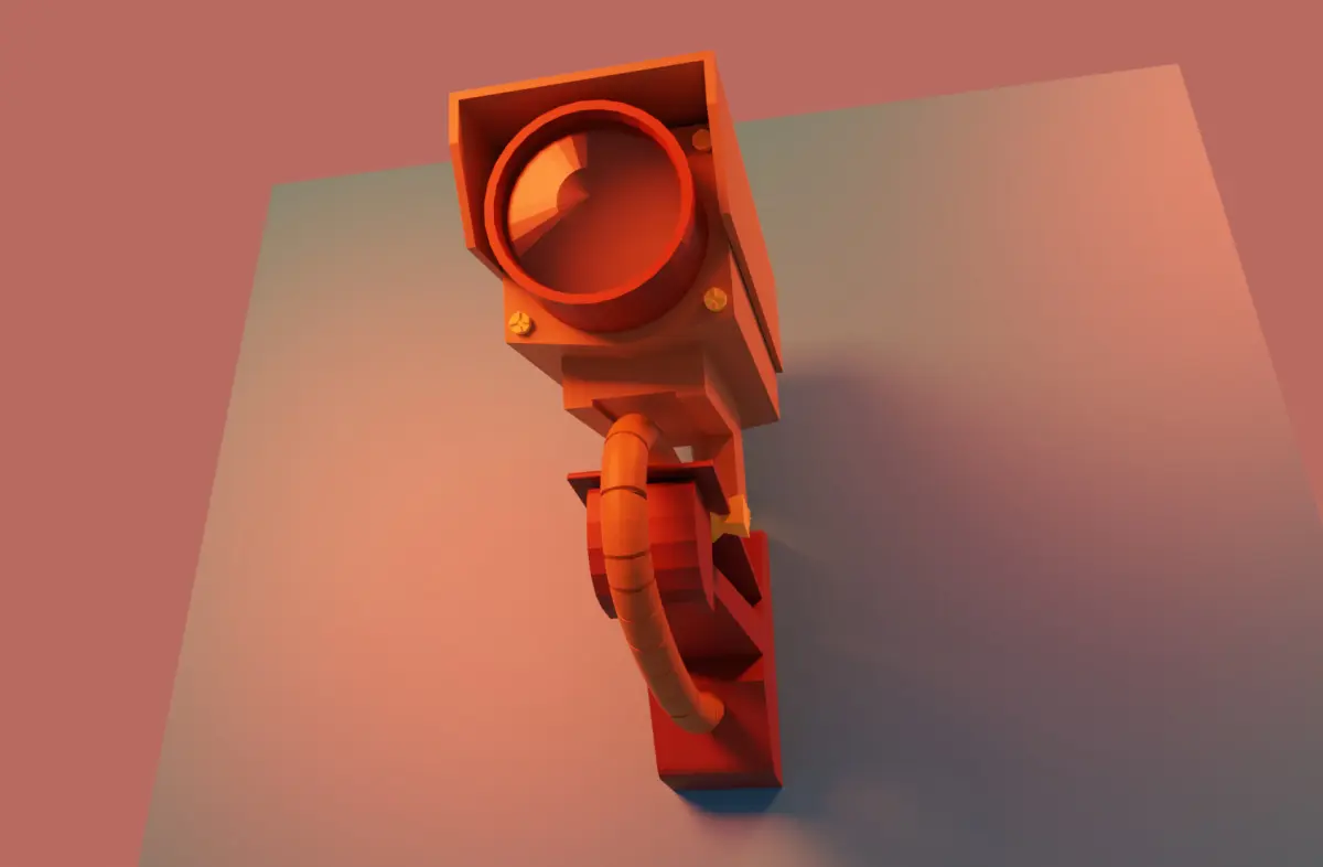 This is a stylized 3D model of a wall-mounted surveillance camera, designed with a clean, modern aesthetic and vibrant color palette. Perfect for use in stylized games, animations, architectural visualizations, or concept art. The model is presented on a simple gradient display panel, ideal for showcasing or integrating into design-focused environments.