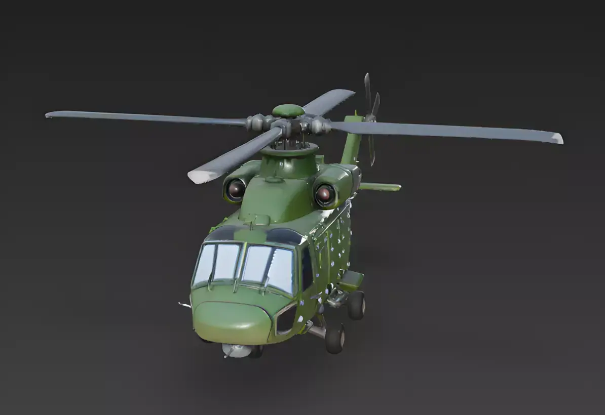 Heavy-Duty Landing GearThe helicopter is equipped with a simplified, sturdy tricycle landing gear system featuring thick rubber wheels. These elements are designed as bold, solid shapes to give the aircraft a grounded and durable stance when stationed on a carrier deck or jungle landing pad.