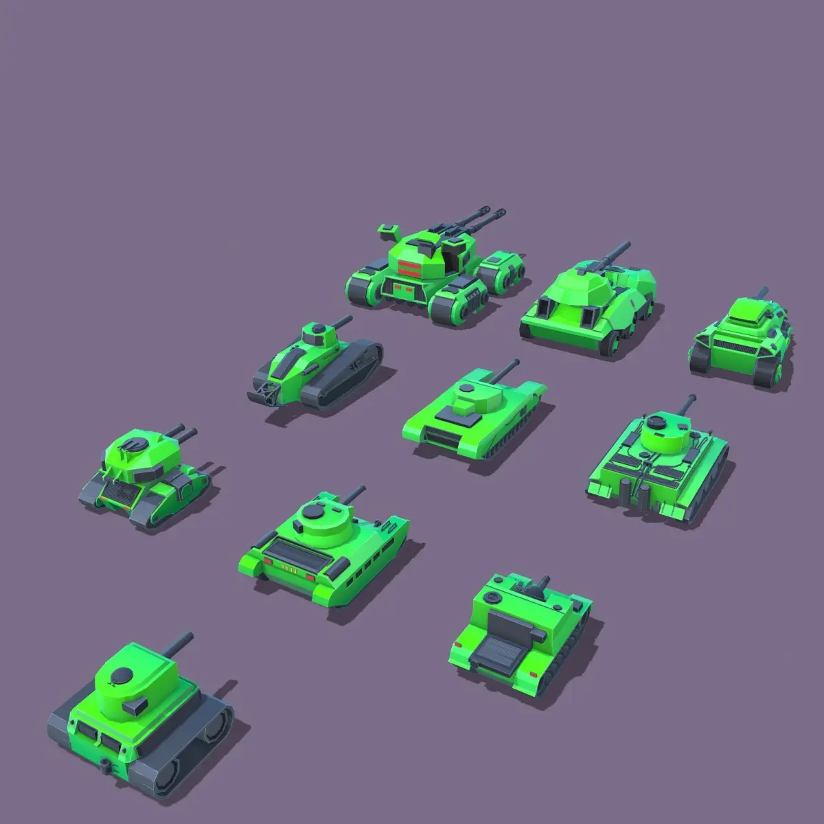 Pak models of stylized tanks. The pack includes 10 different tanks.The models are perfect for the game engine and are optimized for mobile platforms.Hand paint textures. There is only one separate texture for each tank. They come in 4k size and .png format.