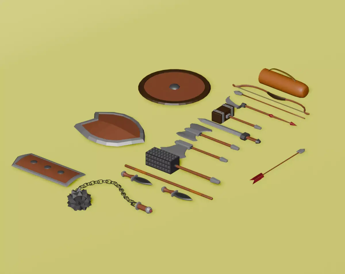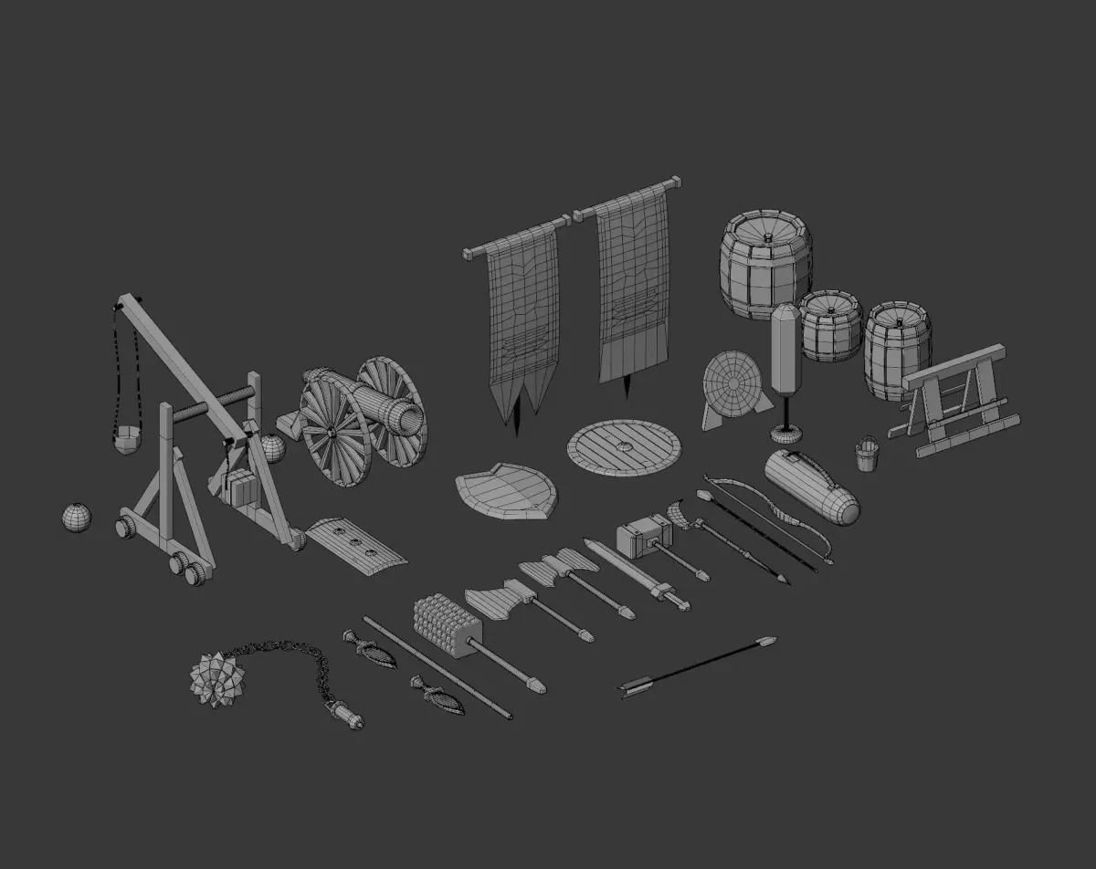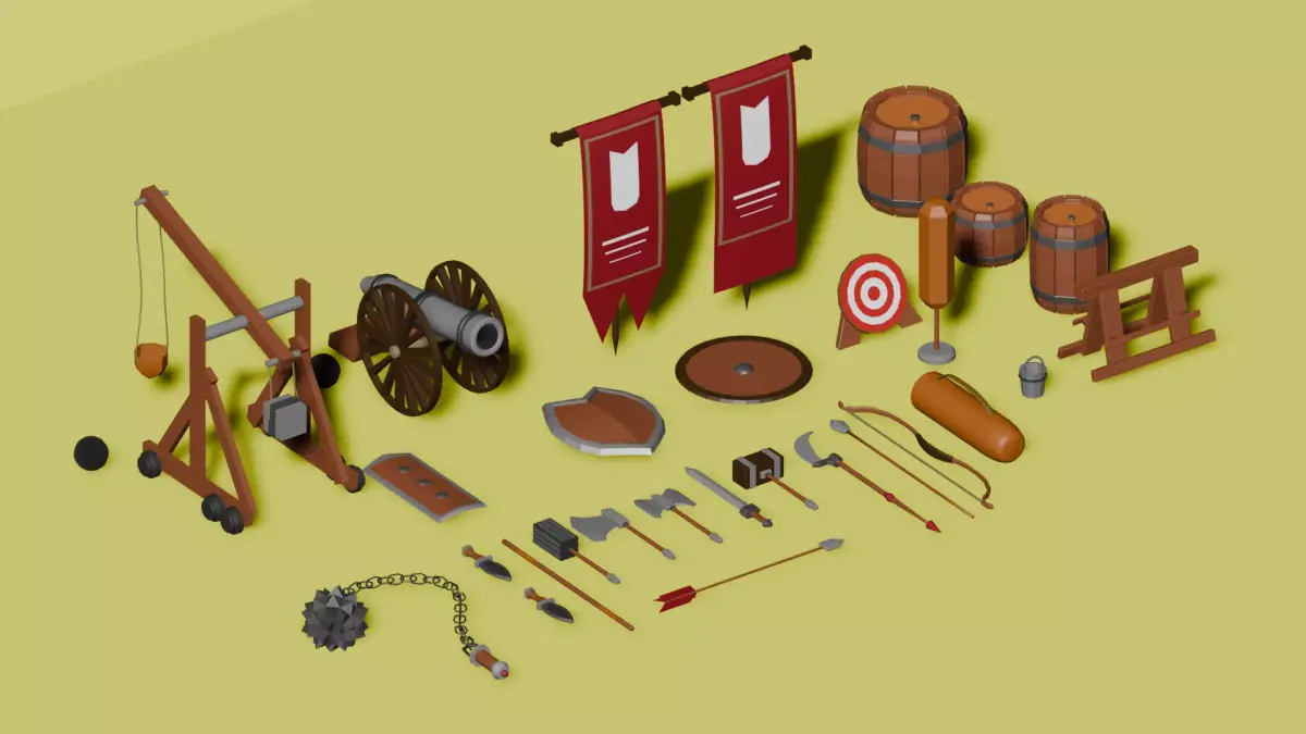 Features20+ medieval-themed assets including weapons, siege gear, propsFlat color style — no textures, just clean materialsLow poly geometry, silhouette-readable designIncludes .blend, .fbx, .obj formatsGame-ready for Unity, Unreal, mobile, or web-based platformsModular layout with combat props, training targets, tamtams, and more
