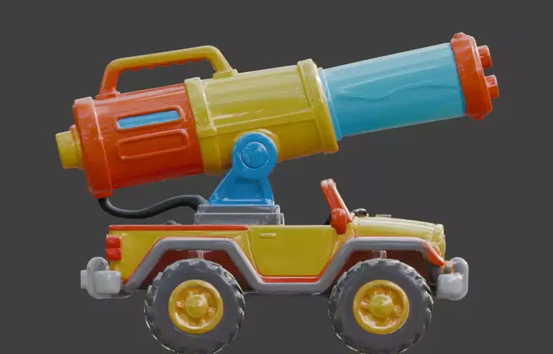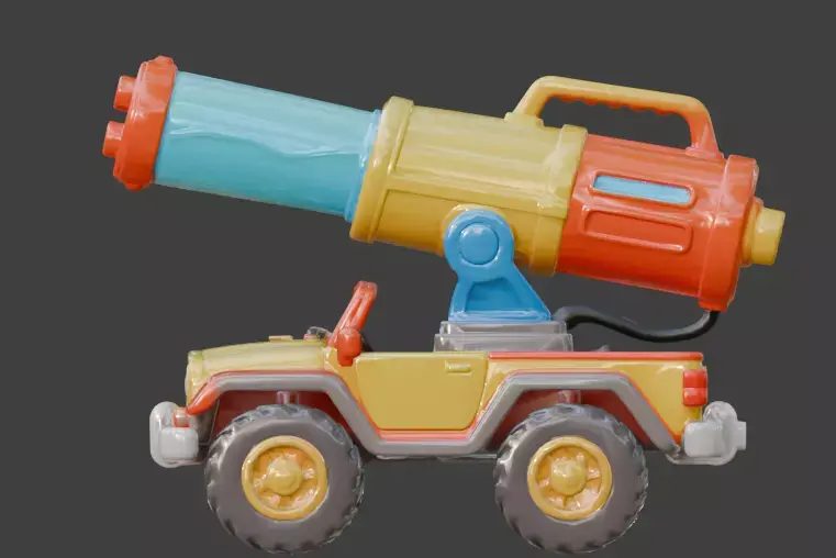 Tagswater gun, toy jeep, stylized, off road, water cannon, summer toy, battle vehicle, low poly, 3d model, game asset, cartoon, playful, yellow car, water fight, adventure, mobile game, 3d prop, heavy tank, whimsical, kids toy