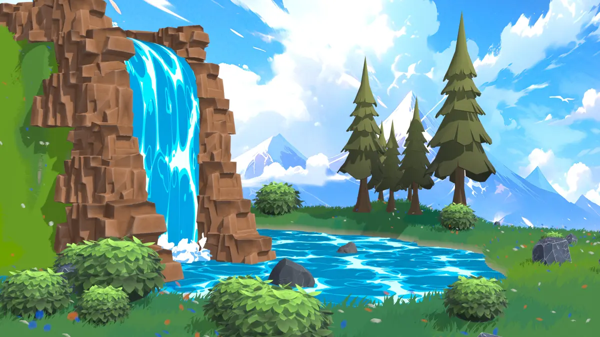 Features:1 Stylized Waterfall – Flowing water with a smooth, animated effect2 Optimized Geometry – Low-poly design for real-time performance3 High-Quality Textures – Procedurally created for a polished look4 Complete Scene Setup – Includes trees, bushes, grass, rocks, and sky backdrop
