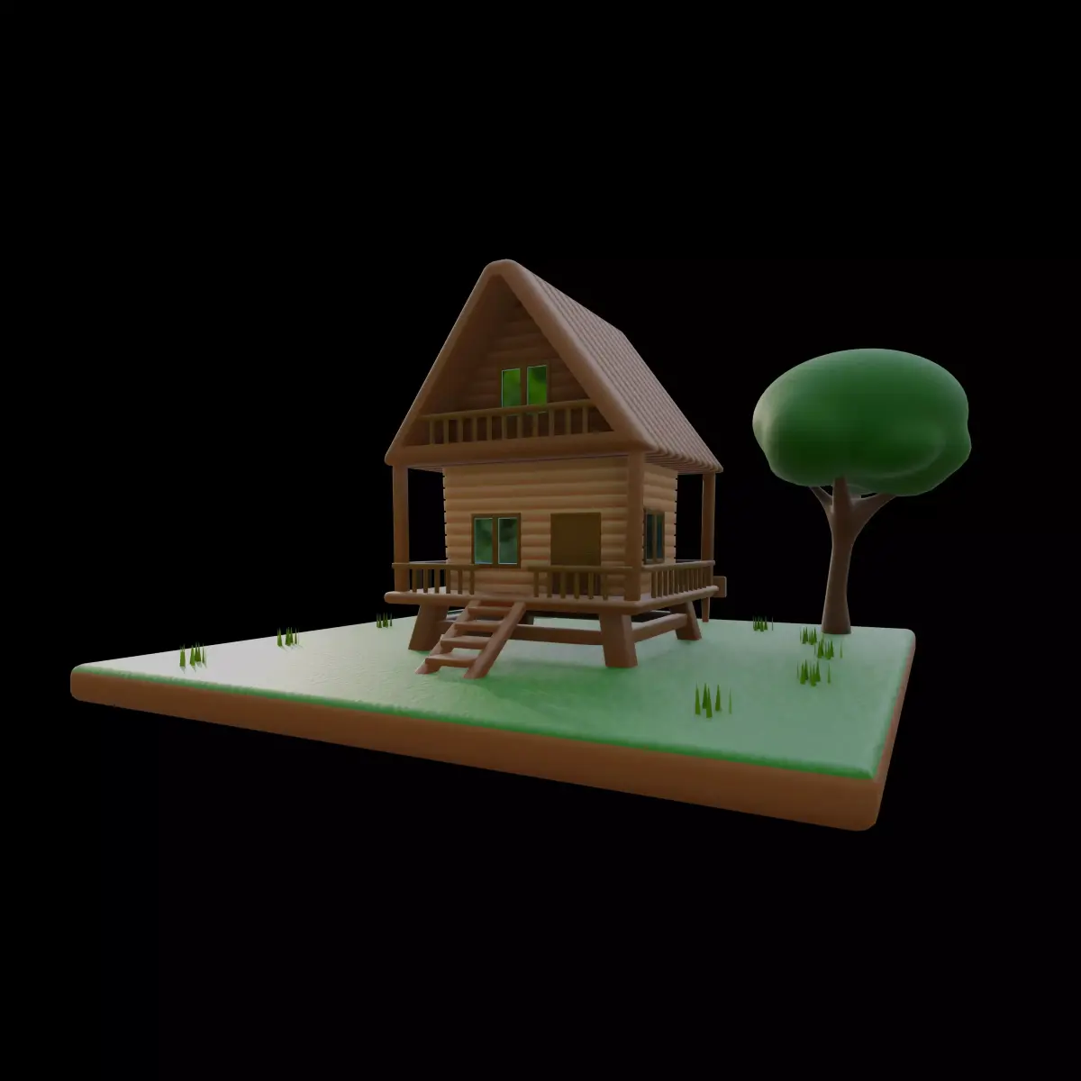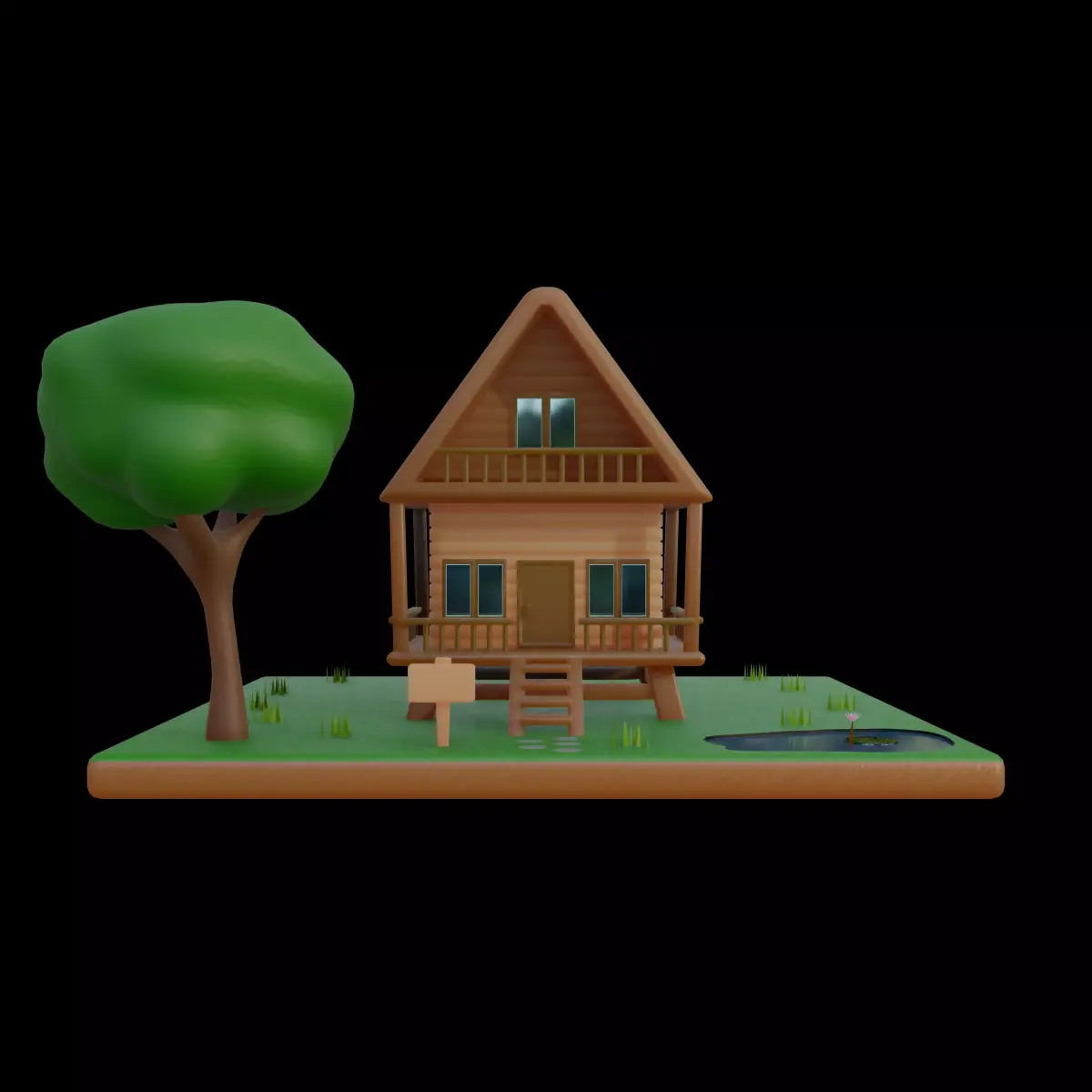 Description:This 3D model features a stylized wooden cabin house designed in a cozy, cartoon-like aesthetic. The cabin stands on a small raised platform with front stairs, balcony railings, and multiple windows, giving it a warm countryside or forest-home appearance. The scene is presented as a complete diorama, including a stylized tree, grass details, stepping stones, a small signboard, and a decorative pond element, all placed on a clean ground base.The model is suitable for games, animations, stylized environment scenes, low-poly worlds, dioramas, and visualization projects. It is built with clean and optimized topology, non-overlapping UV maps, and includes high-quality 4K PBR textures to ensure consistent results in both real-time engines and offline rendering.