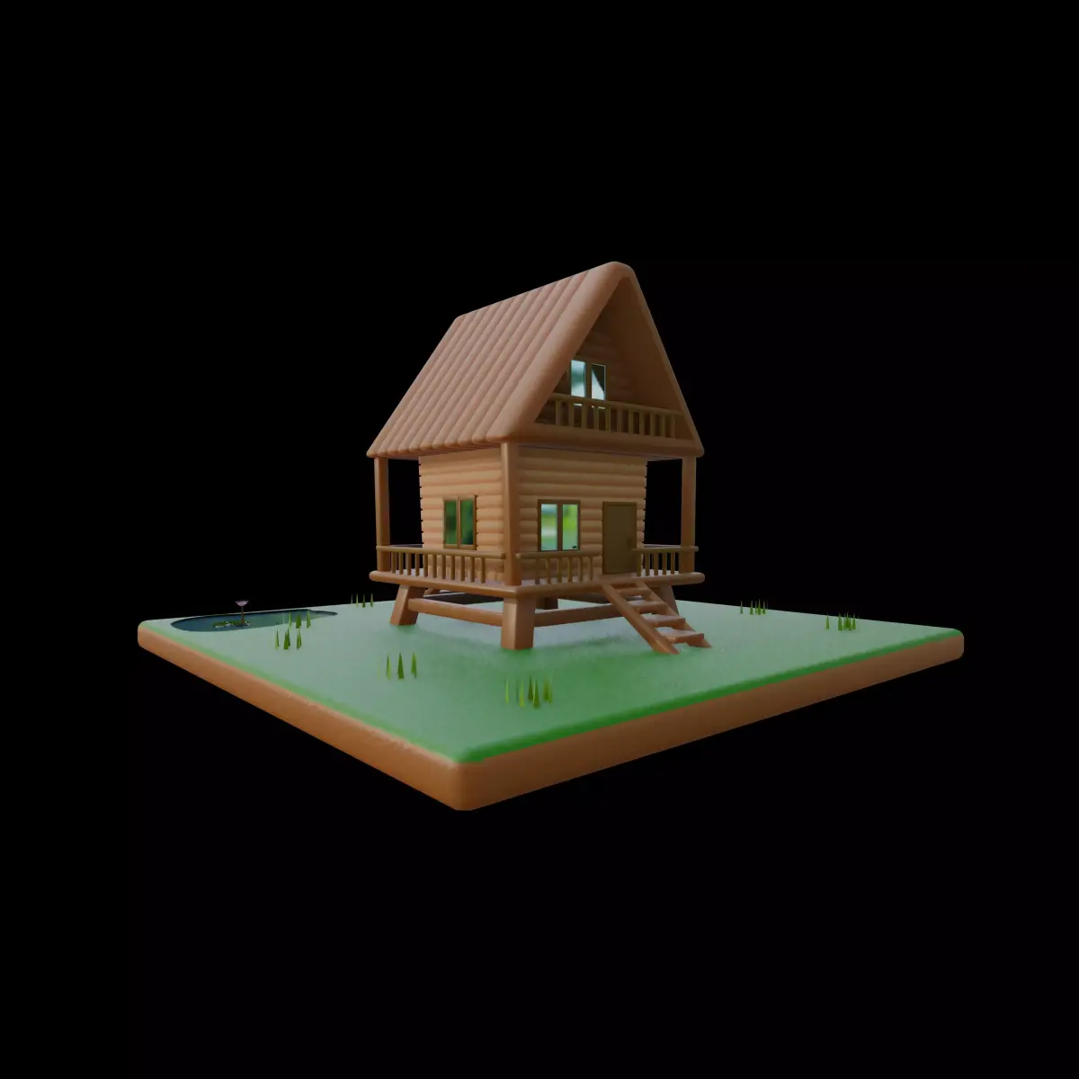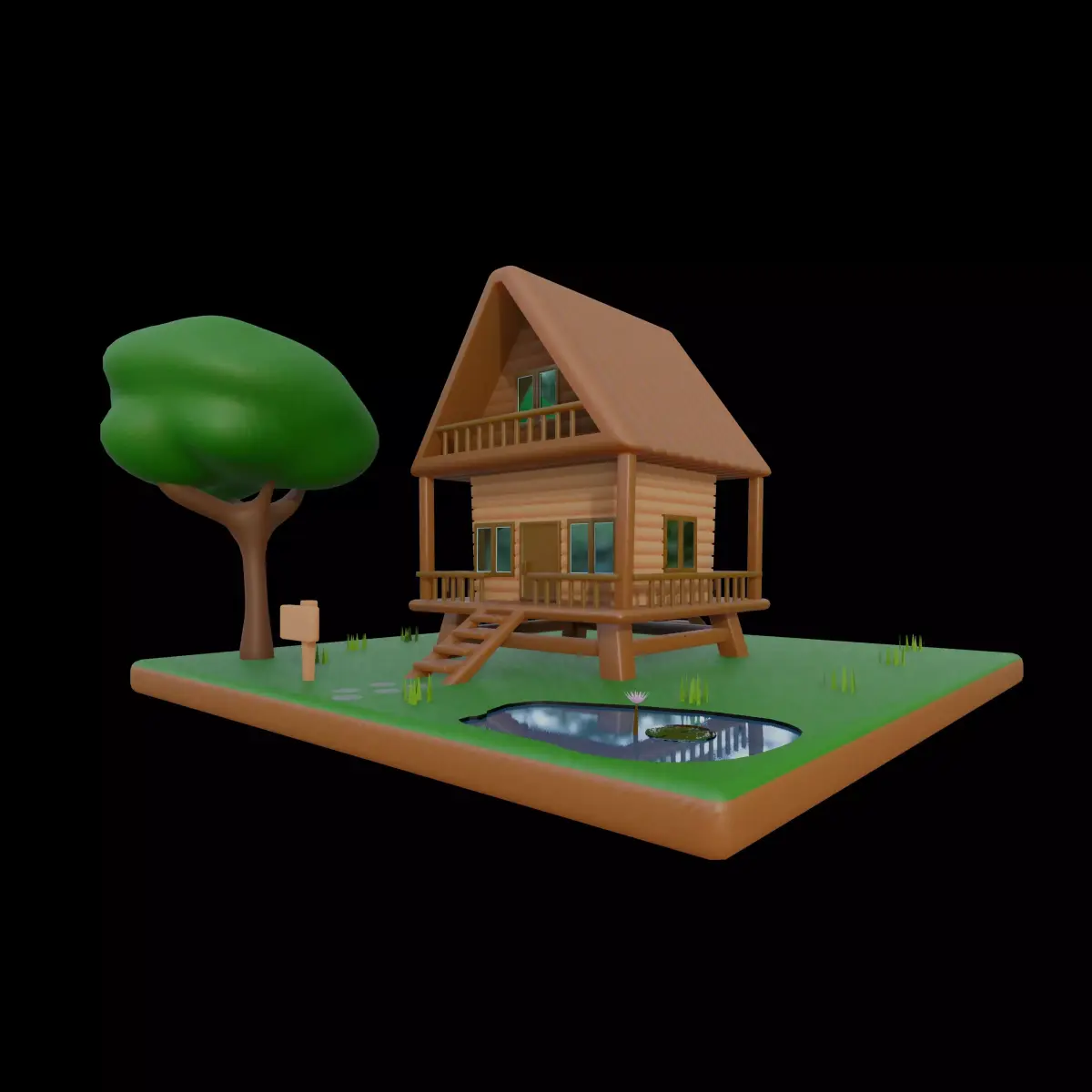cabin house wooden stylized cartoon environment diorama forest home tree pond exterior lowpoly scene 3dmodel blender pbr uvmapped gameasset