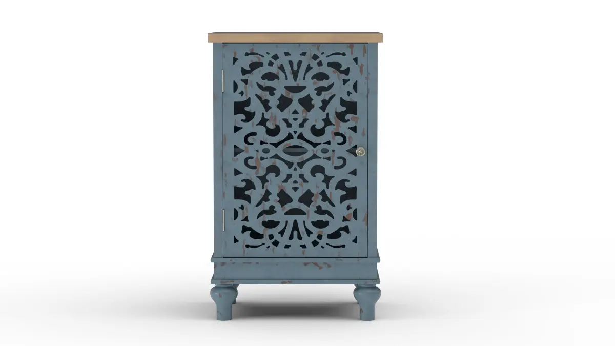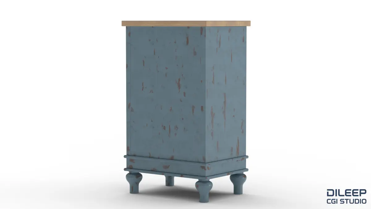 Stylized Wooden CabinetThis highly detailed 3D model of a vintage wooden cabinet is designed for use in games, architectural visualizations, and product renderings. The cabinet features a distressed blue-painted body, natural wood top surface, and an ornate, carved front door. Ideal for antique-themed interiors, classic living rooms, or stylized environments.Model Details:Created in: Autodesk MayaTextured in: Substance 3D PainterVertices: 35,577Faces: 35,774Triangles: 71,156UVs: Non-overlapping and clean