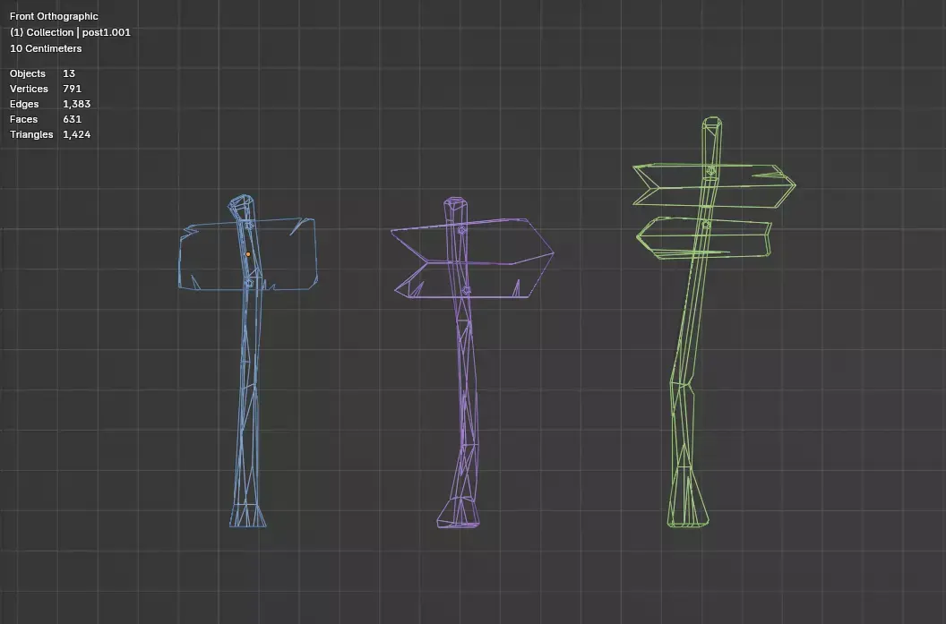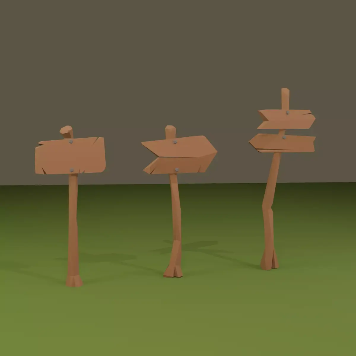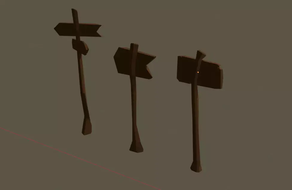 A small pack of hand-crafted low-poly wooden signposts perfect for stylized, cartoony, or adventure-themed games; includes three unique signpost variations with clean topology, simple materials, and game-ready performance.