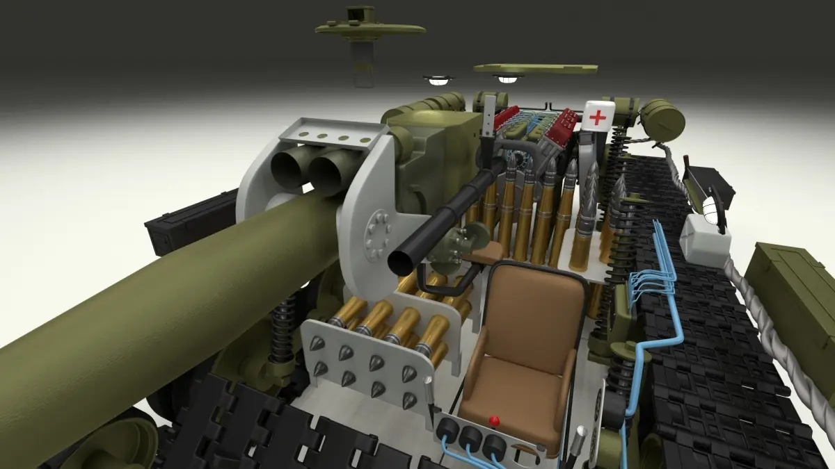 The model contains a highly detailed interior(controls, gauges, ammo, radio, main gun) and has the drivetrain(engine, radiators, transmission, tracks, suspension) fully modeled as seen in the images.