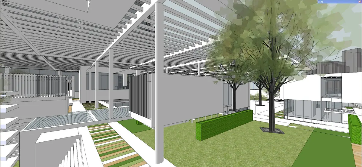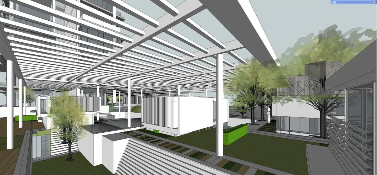This is an SU model of a modern high-rise commercial office building with staggered balconies, which incorporates rich spaces and landscapes in its design.