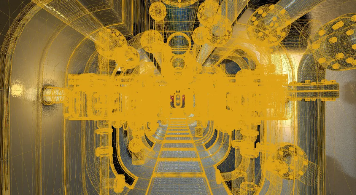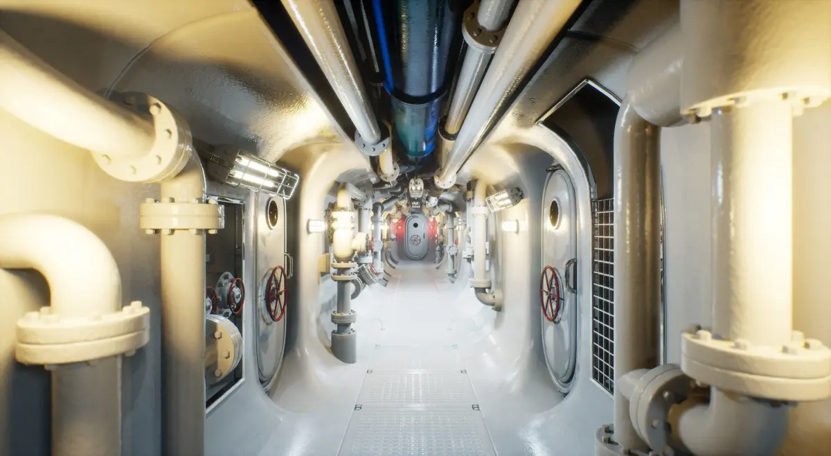 A DETAILED UNREAL ENGINE SCENE OF A SUBMARINE INTERIOR / INDUSTRIAL CORRIDOR:
