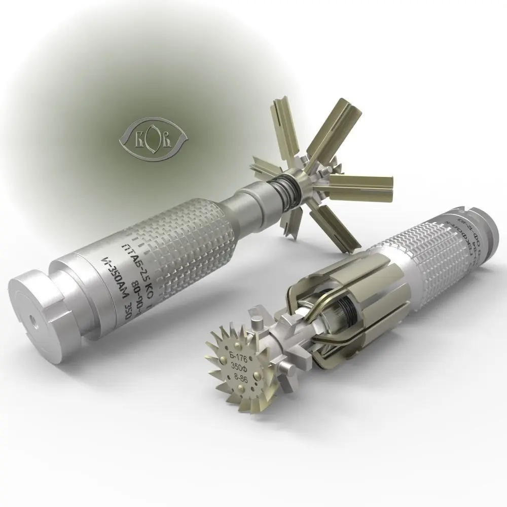 This is the (USSR) PTAB-2.5KO, a High-Explosive Anti-Tank (HEAT), Dual-Purpose (DP), fin-stabilised submunition with a Self-Destruct (SD)