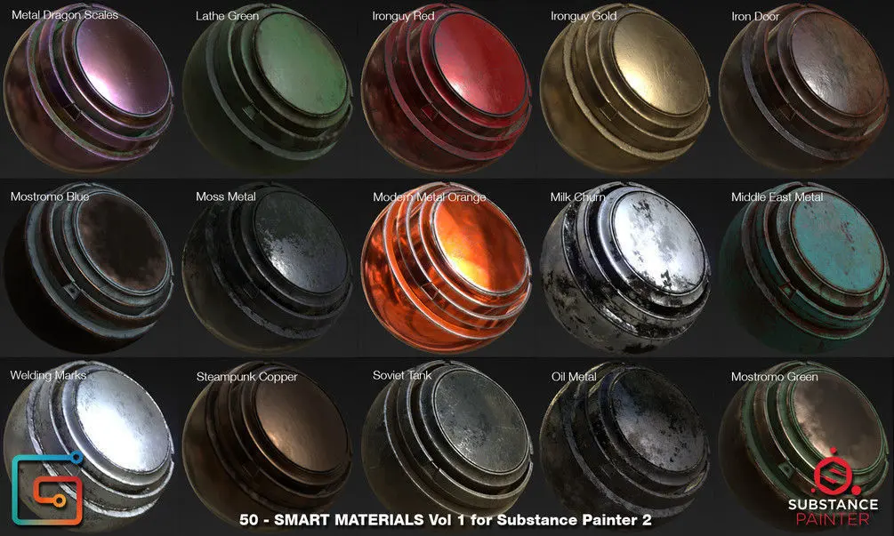 Substance Painter Smart Materials Vol 1 contains 50 original Materials made in Allegorithmic Substance Painter 2. Ideal for Hard Surface modeling!!!. This package include the following materials: