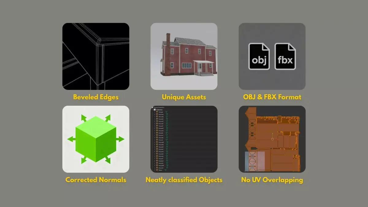 - Every model has carefully corrected normals to ensure perfect shading and light reflection in game engines and offline renders.