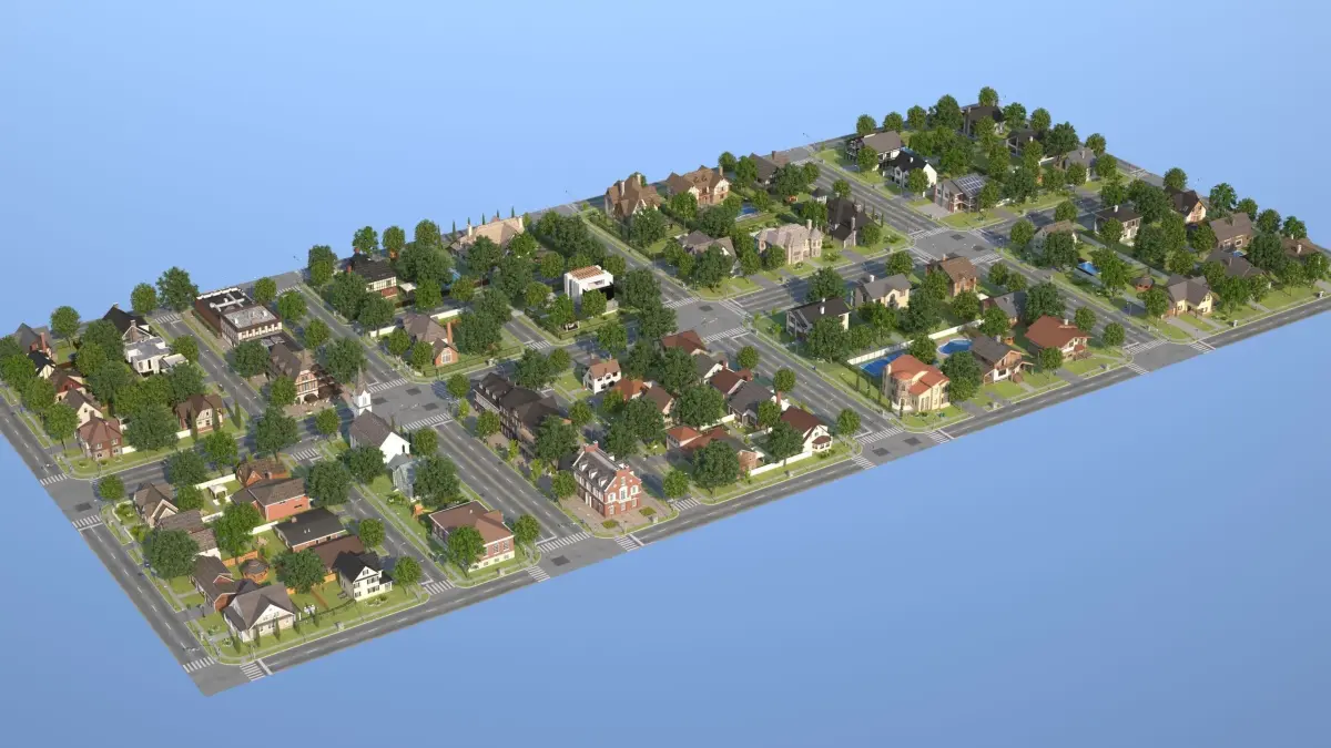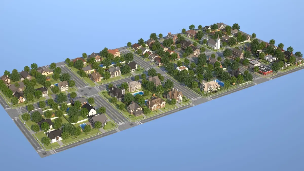 Highly detailed modular town containing detailed houses and buildings, road tiles, street furniture, textures and more.