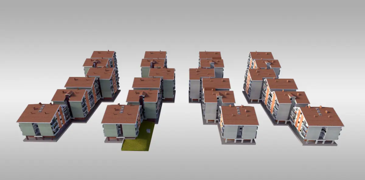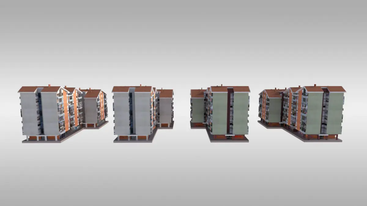 These residential complexes are part of a large suburban neighborhood in Belgrade, Serbia. Although they are somewhat aged, they are quality mid-wealth residences. Model is characterised by low geometry and real photo textures.