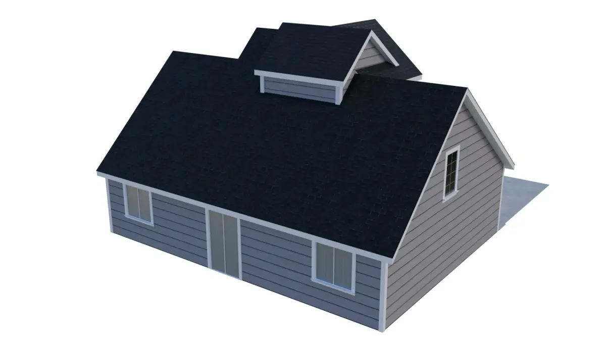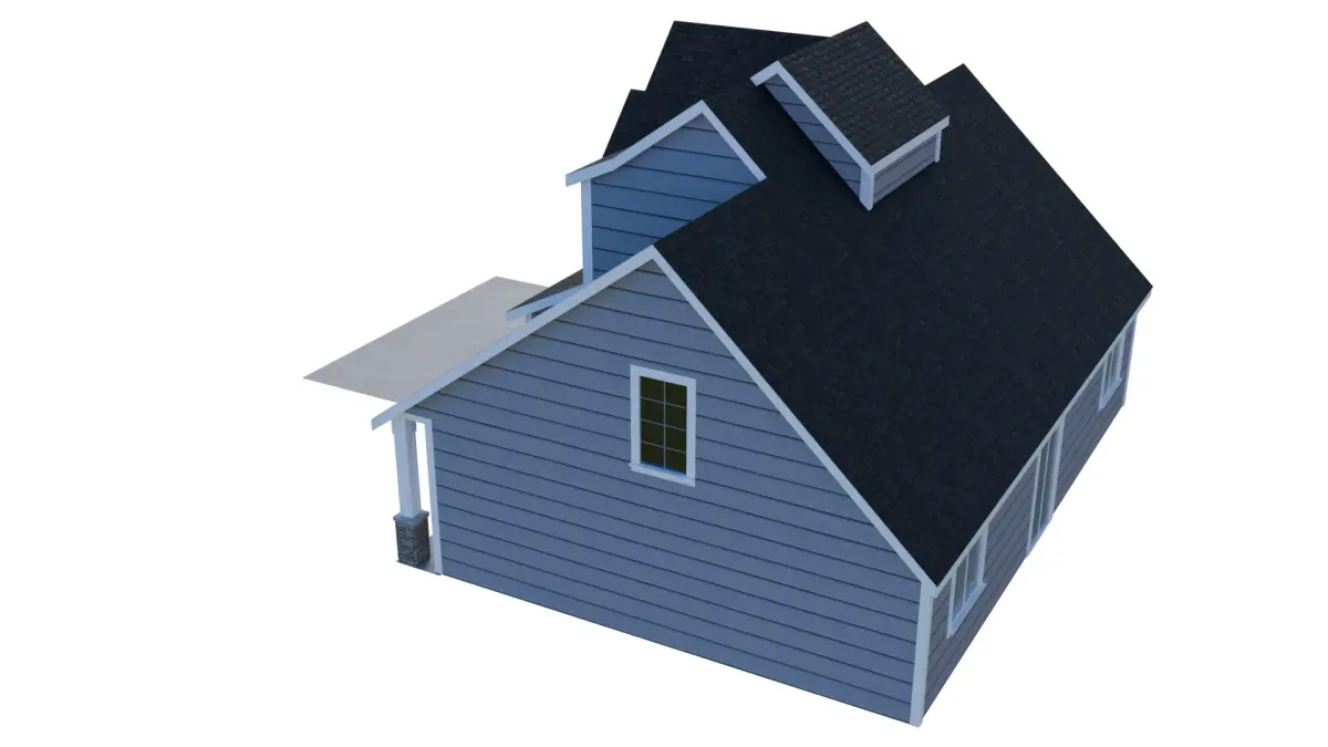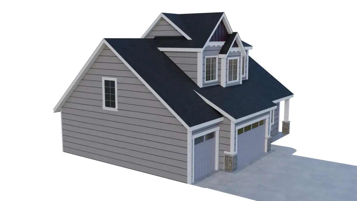 This detailed 3D model captures the charm and simplicity of a classic suburban single-story home. The exterior features a mid-pitched roof with asphalt shingles, horizontal vinyl siding, and a welcoming covered front porch with wood columns. A two-car garage is attached on the left side, seamlessly integrated into the overall structure.