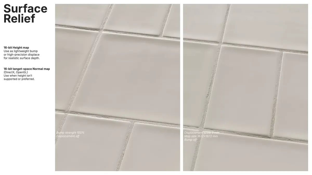 Surface relief is provided by a RAW 16-bit height map tuned for a true 3 mm depth (1872×1872 mm surface), suitable for lightweight bump or precise displacement. A 16-bit tangent-space normal map (DirectX/OpenGL) is included for cases where height-based workflows aren’t preferred.