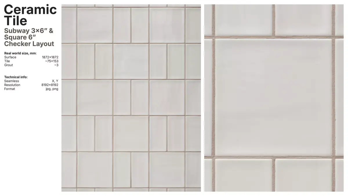The package includes 8 diffuse variations with matching grout tones, and a flexible color base that works out-of-the-box or as a starting point for custom looks.