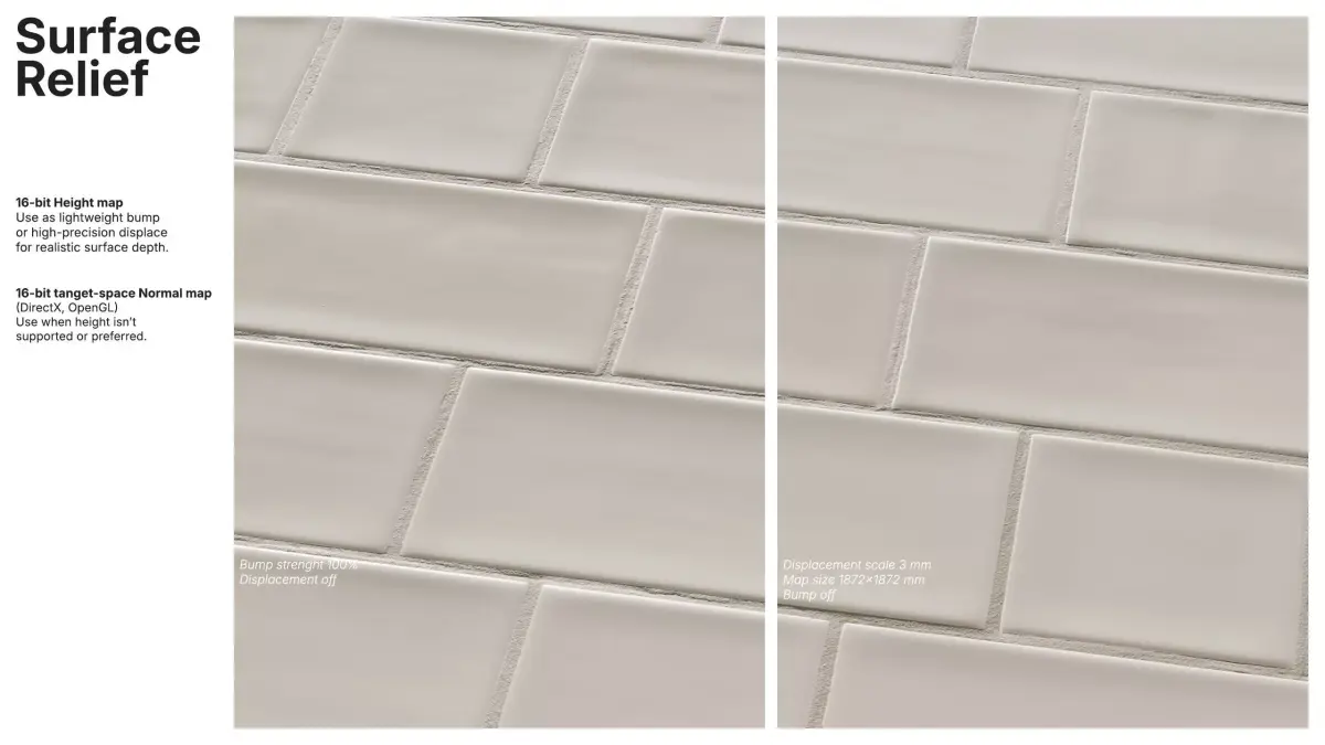 Surface relief is provided by a RAW 16-bit height map tuned for a true 3 mm depth (1872x1872 mm surface), suitable for lightweight bump or precise displacement. A 16-bit tangent-space normal map (DirectX/OpenGL) is included for cases where height-based workflows aren’t preferred.